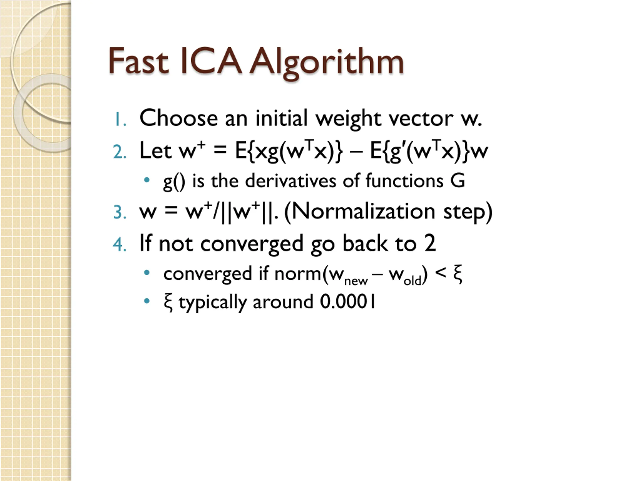Fast ICA Algorithm 1. Choose an initial weight vector w. 2. Let w+ = E{xg(wTx)} E{g (wTx)}w g() is the derivatives of functions G 3. w = w+/||w+||. (Normalization step) 4. If not converged go back to 2 converged if norm(wnew wold) < typically around 0.0001