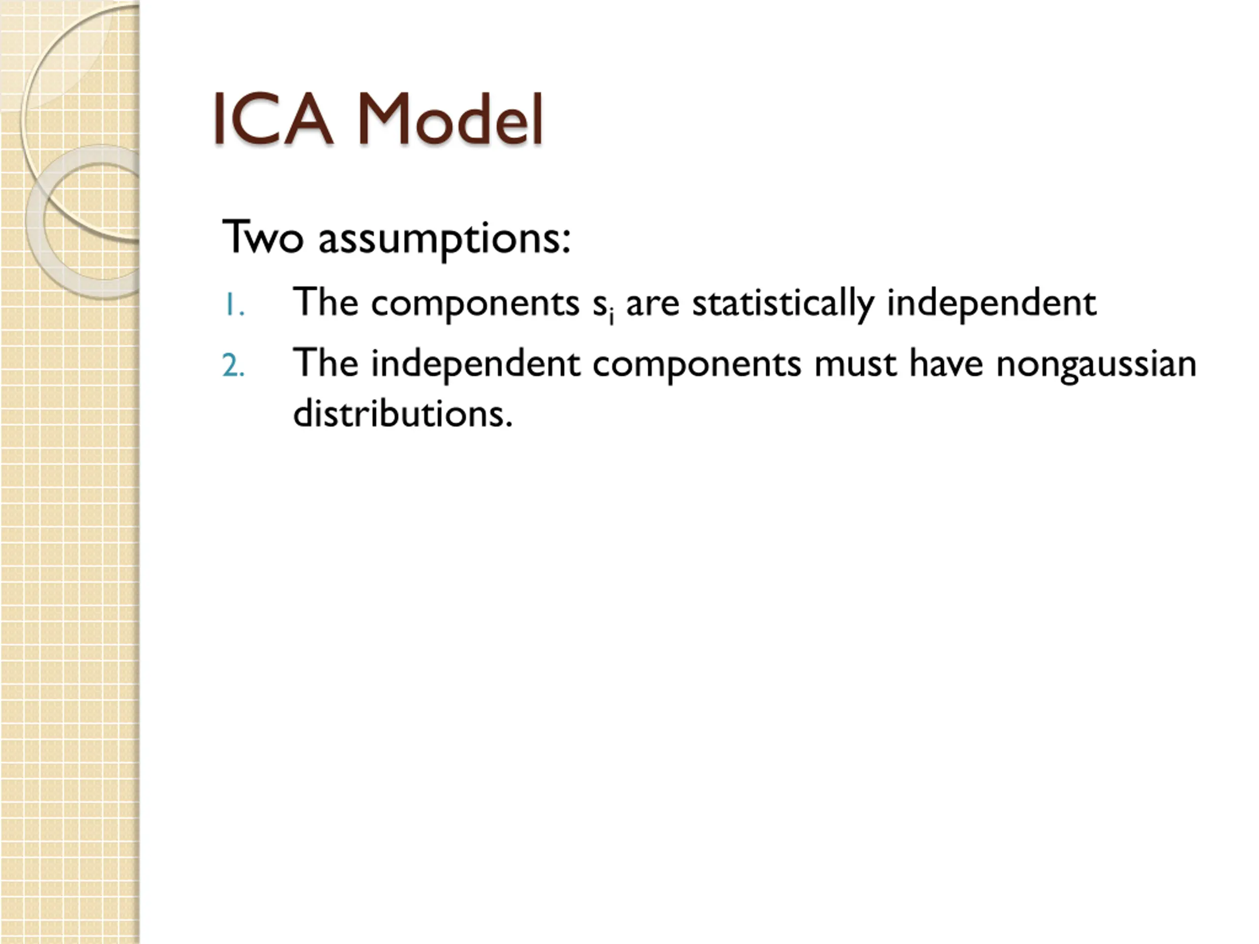 ICA Model Two assumptions: The components si are statistically independent 2. The independent components must have nongaussian distributions. 1.