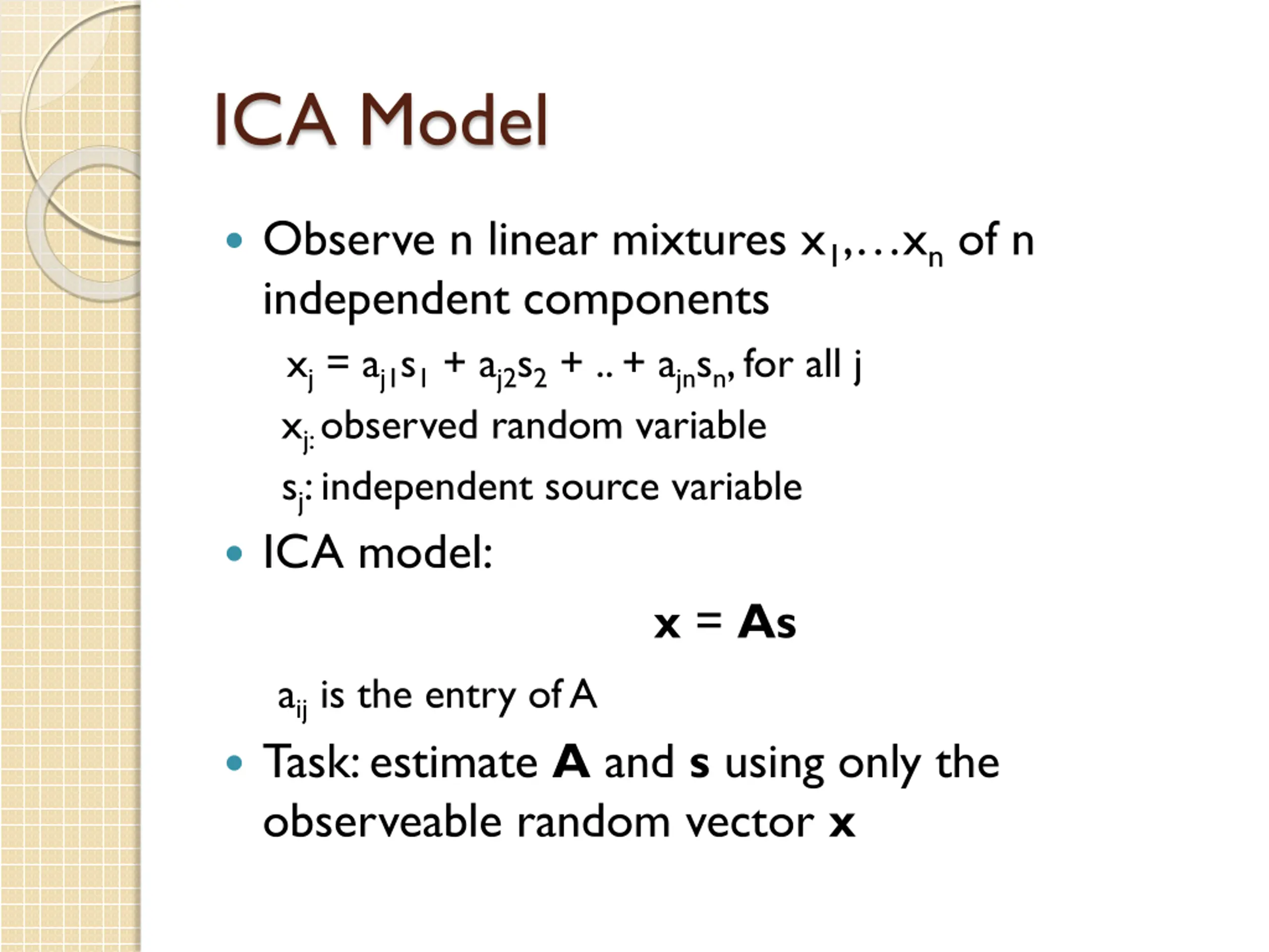 ICA Model Observe n linear mixtures x1, xn of n independent components xj= aj1s1+ aj2s2+ .. + ajnsn, for all j xj: observed random variable sj: independent source variable ICA model: x = As aijis the entry of A Task: estimate A and s using only the observeable random vector x