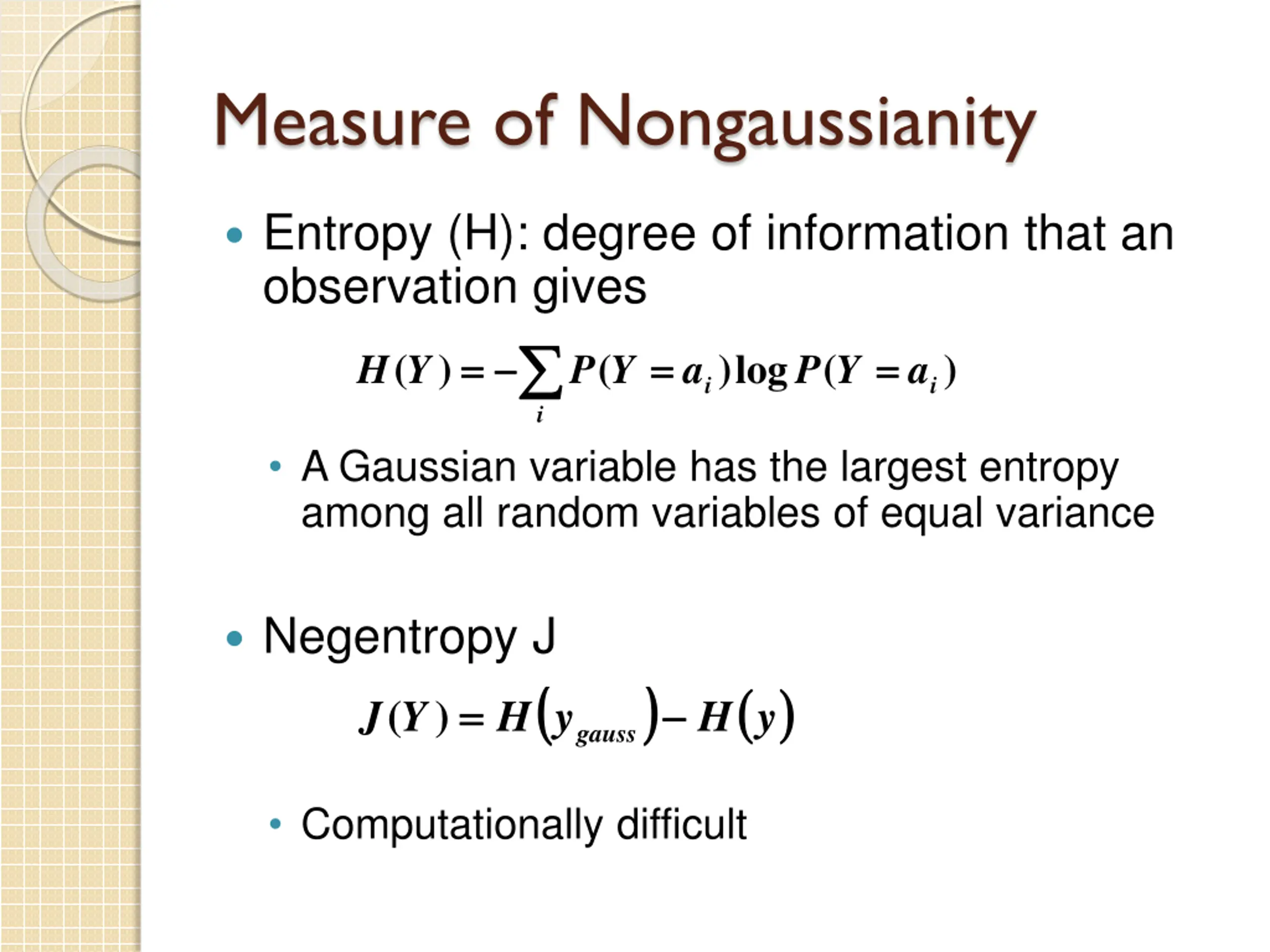 Measure of Nongaussianity Entropy (H): degree of information that an observation gives i = = = = = = H Y ( P Y ( a P Y ( a ) ) log ) i i A Gaussian variable has the largest entropy among all random variables of equal variance Negentropy J ( ( ) ) ( ( ) ) y H = = gauss J Y ( H y ) Computationally difficult