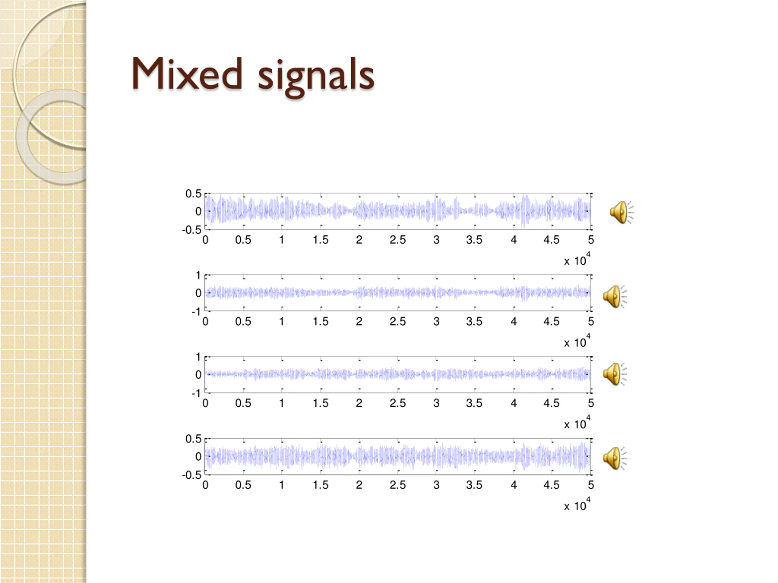Mixed signals 0.5 0 -0.5 0 0.5 1 1.5 2 2.5 3 3.5 4 4.5 5 4 x 10 1 0 -1 0 0.5 1 1.5 2 2.5 3 3.5 4 4.5 5 4 x 10 1 0 -1 0 0.5 1 1.5 2 2.5 3 3.5 4 4.5 5 4 x 10 0.5 0 -0.5 0 0.5 1 1.5 2 2.5 3 3.5 4 4.5 5 4 x 10