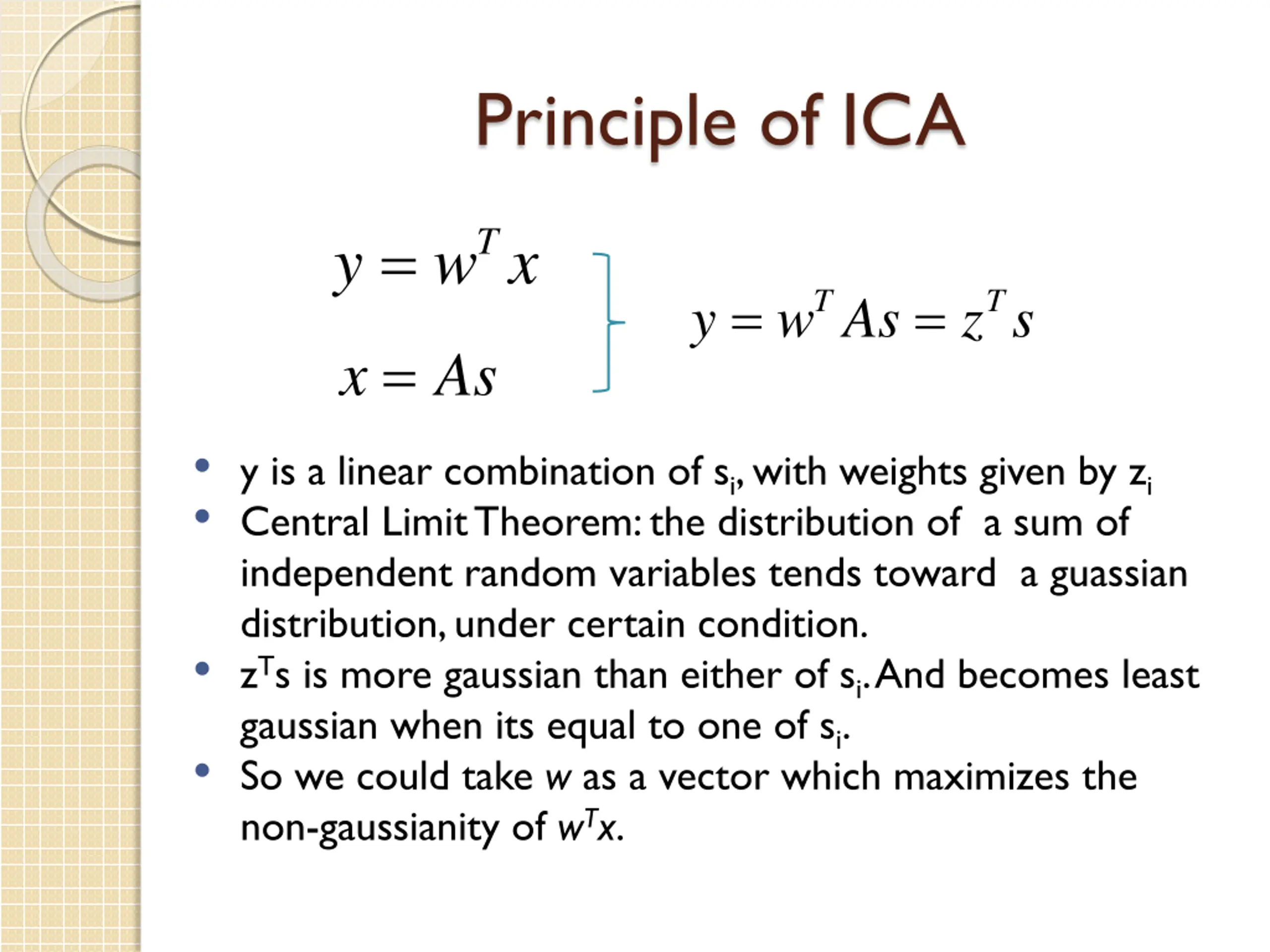 Principle of ICA = T y w x = = T T y w As z s = x As y is a linear combination of si, with weights given by zi Central Limit Theorem: the distribution of a sum of independent random variables tends toward a guassian distribution, under certain condition. zTs is more gaussian than either of si. And becomes least gaussian when its equal to one of si. So we could take w as a vector which maximizes the non-gaussianity of wTx.