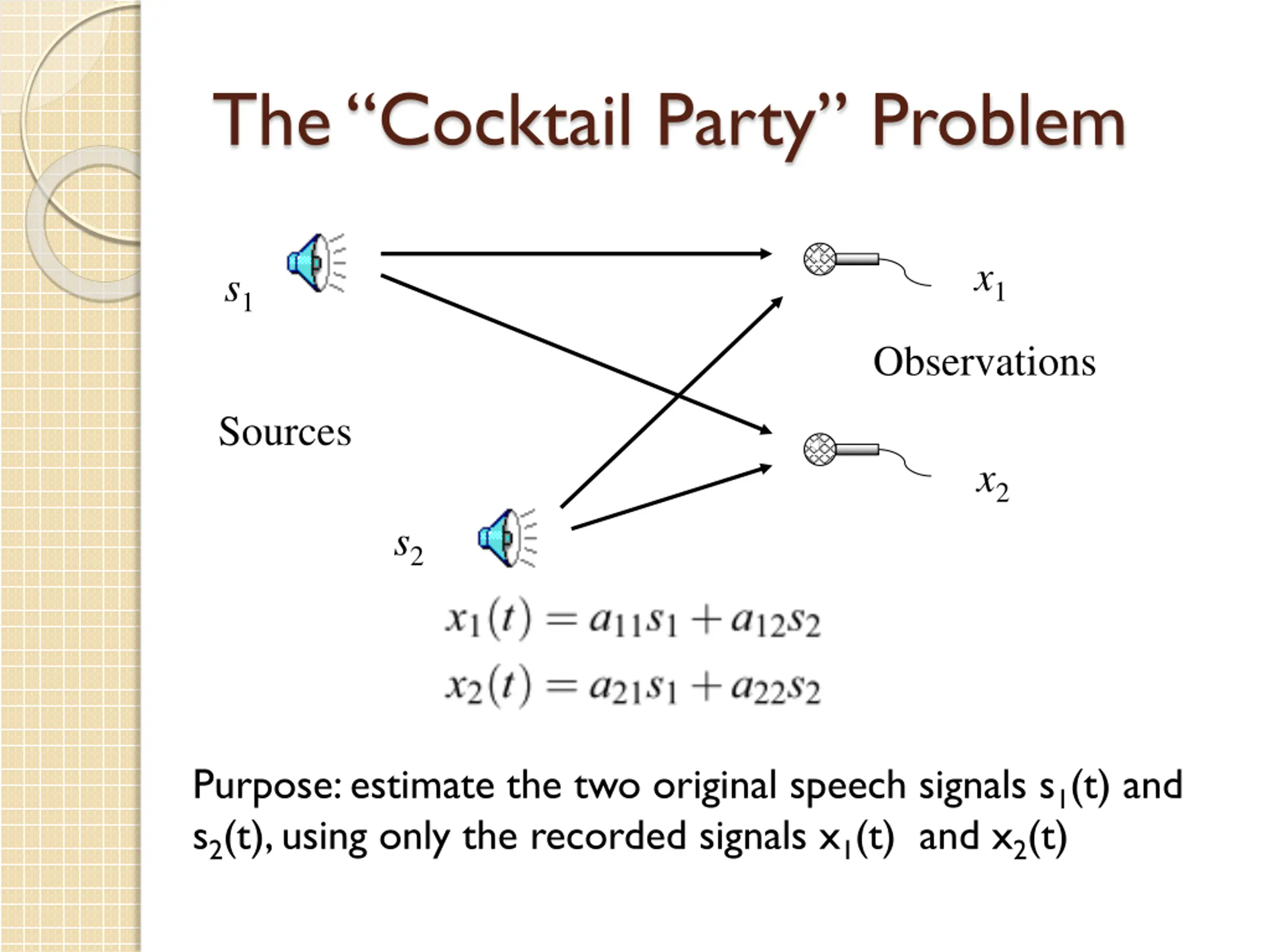 The Cocktail Party Problem x1 s1 Observations Sources x2 s2 Purpose: estimate the two original speech signals s1(t) and s2(t), using only the recorded signals x1(t) and x2(t)