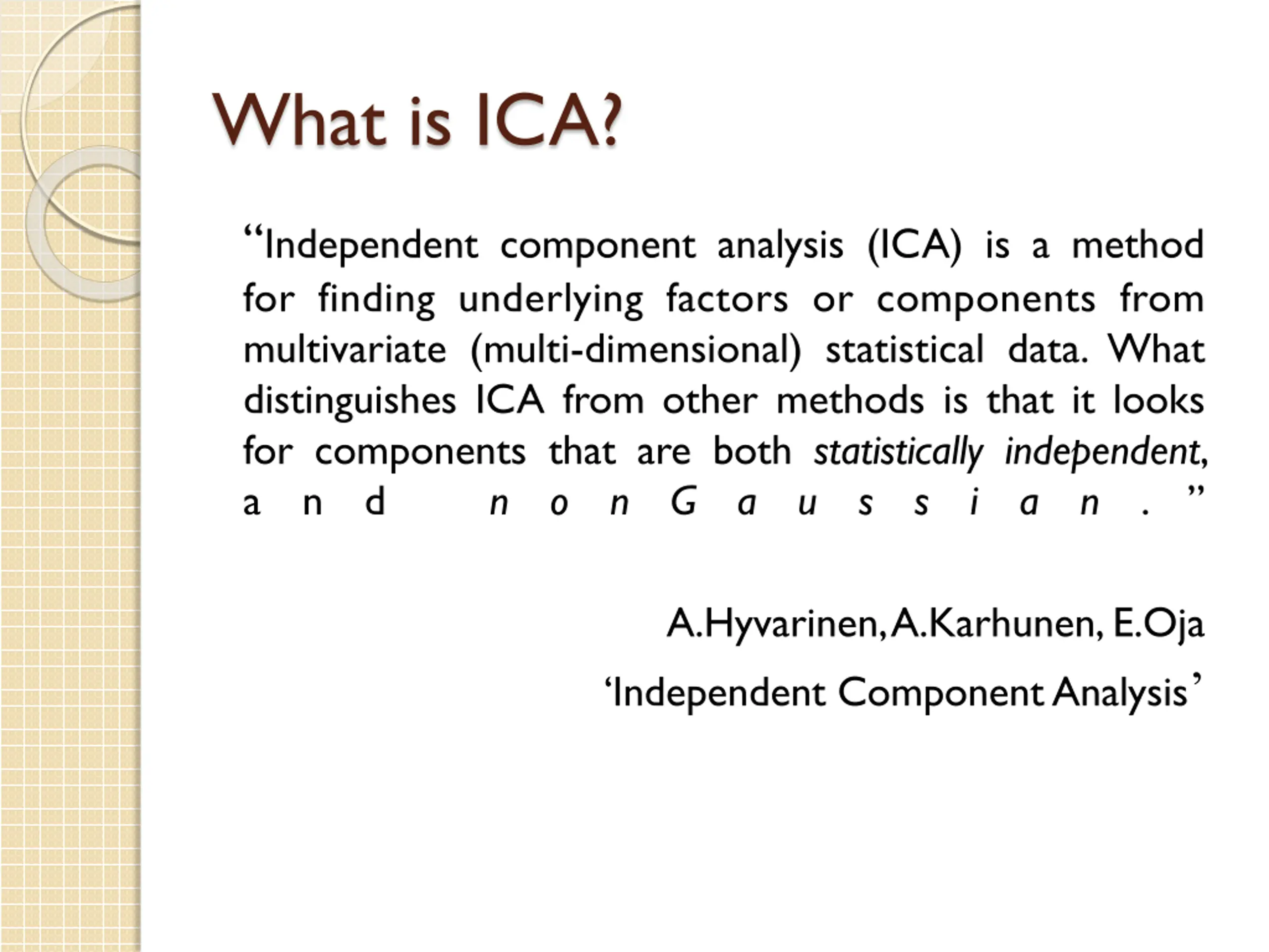What is ICA? Independent component analysis (ICA) is a method for finding underlying factors or components from multivariate (multi-dimensional) statistical data. What distinguishes ICA from other methods is that it looks for components that are both statistically independent, a n d n o n G a u s s i a n . A.Hyvarinen, A.Karhunen, E.Oja Independent Component Analysis