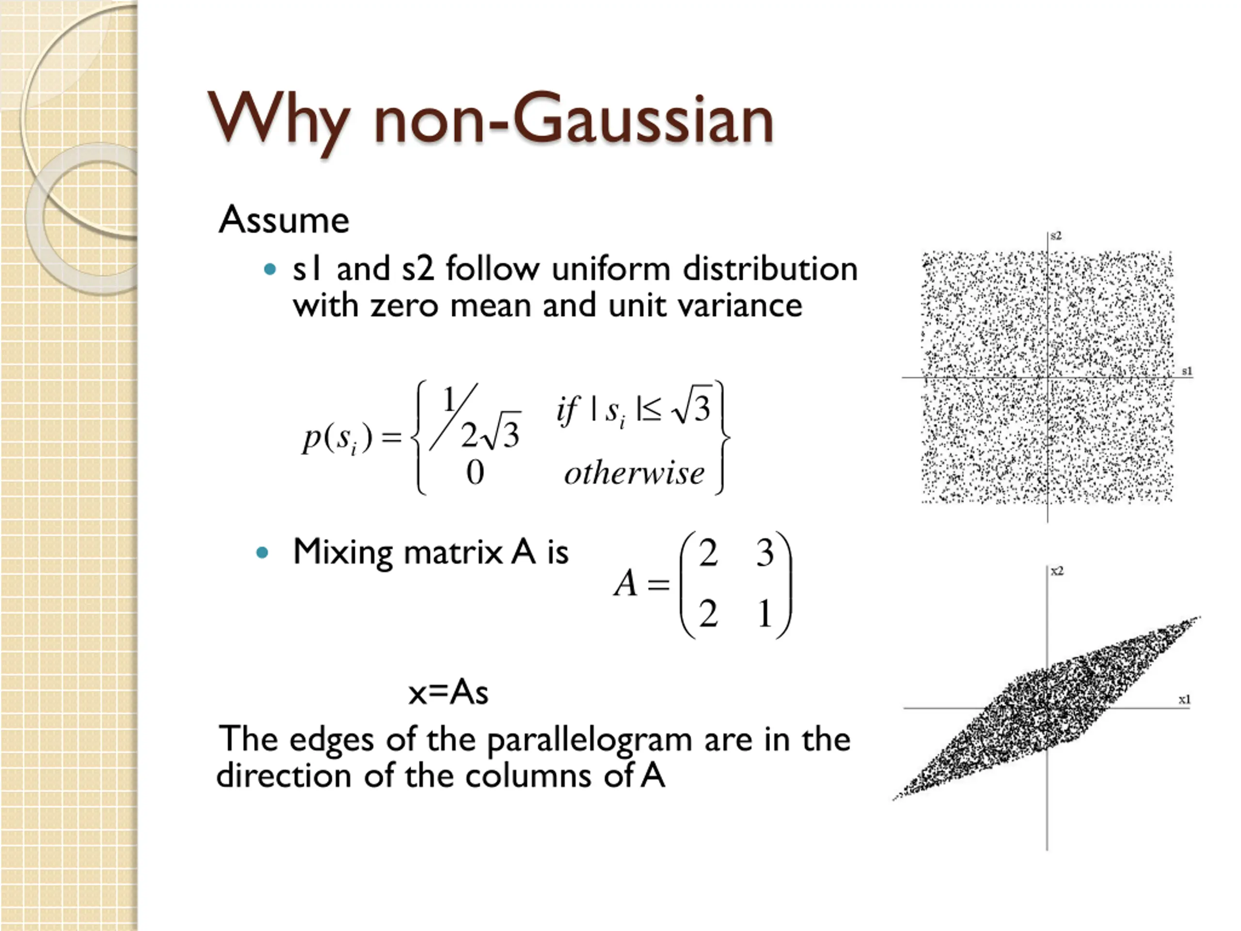 Why non-Gaussian Assume s1 and s2 follow uniform distribution with zero mean and unit variance 1 | | 3 if s i = 2 3 ( ) p s i 0 otherwise 2 3 Mixing matrix A is = A 2 1 x=As The edges of the parallelogram are in the direction of the columns of A