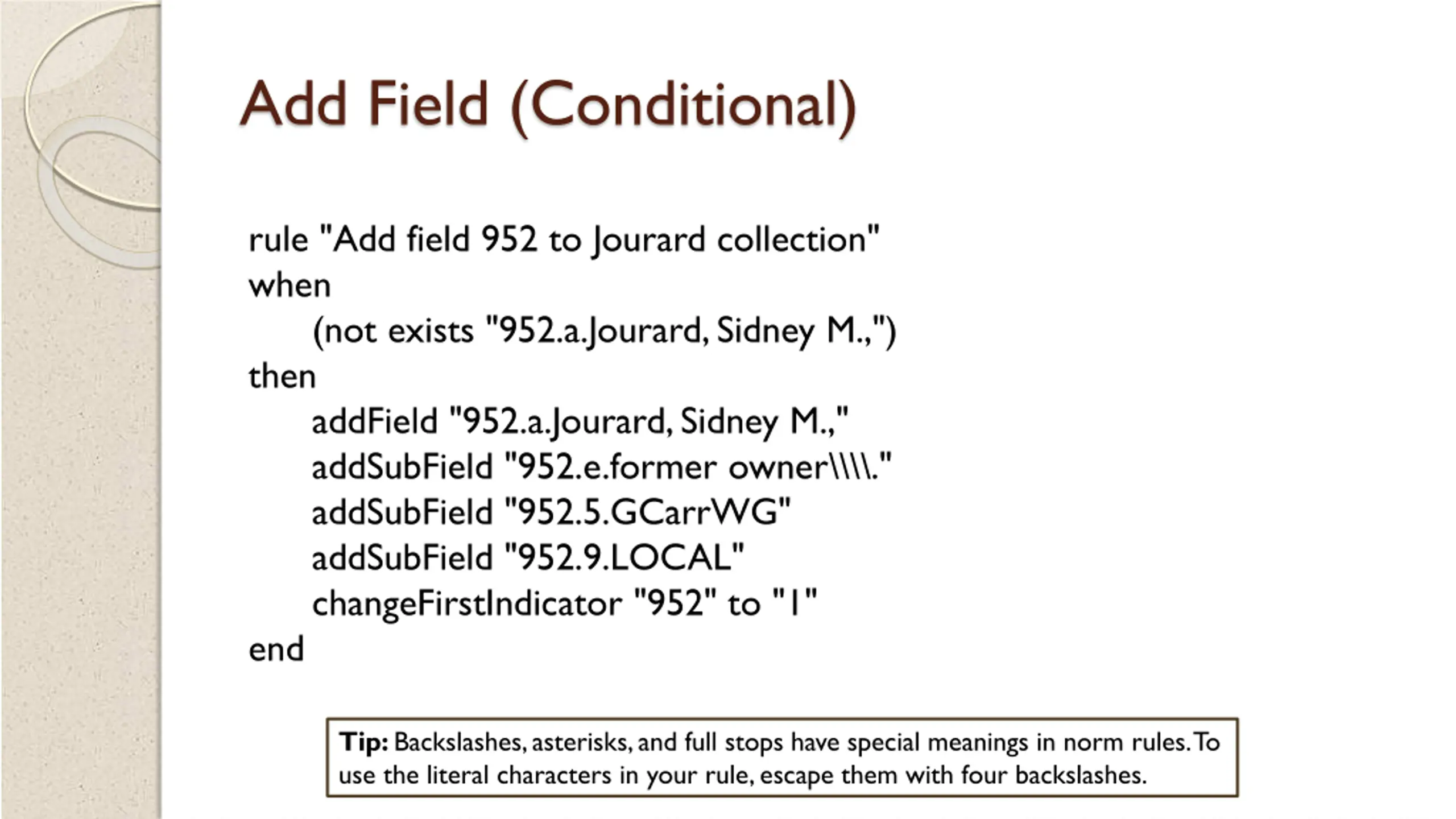 Add Field (Conditional) rule "Add field 952 to Jourard collection" when (not exists "952.a.Jourard, Sidney M.,") then addField "952.a.Jourard, Sidney M.," addSubField "952.e.former owner\\\\." addSubField "952.5.GCarrWG" addSubField "952.9.LOCAL" changeFirstIndicator "952" to "1" end Tip: Backslashes, asterisks, and full stops have special meanings in norm rules. To use the literal characters in your rule, escape them with four backslashes.