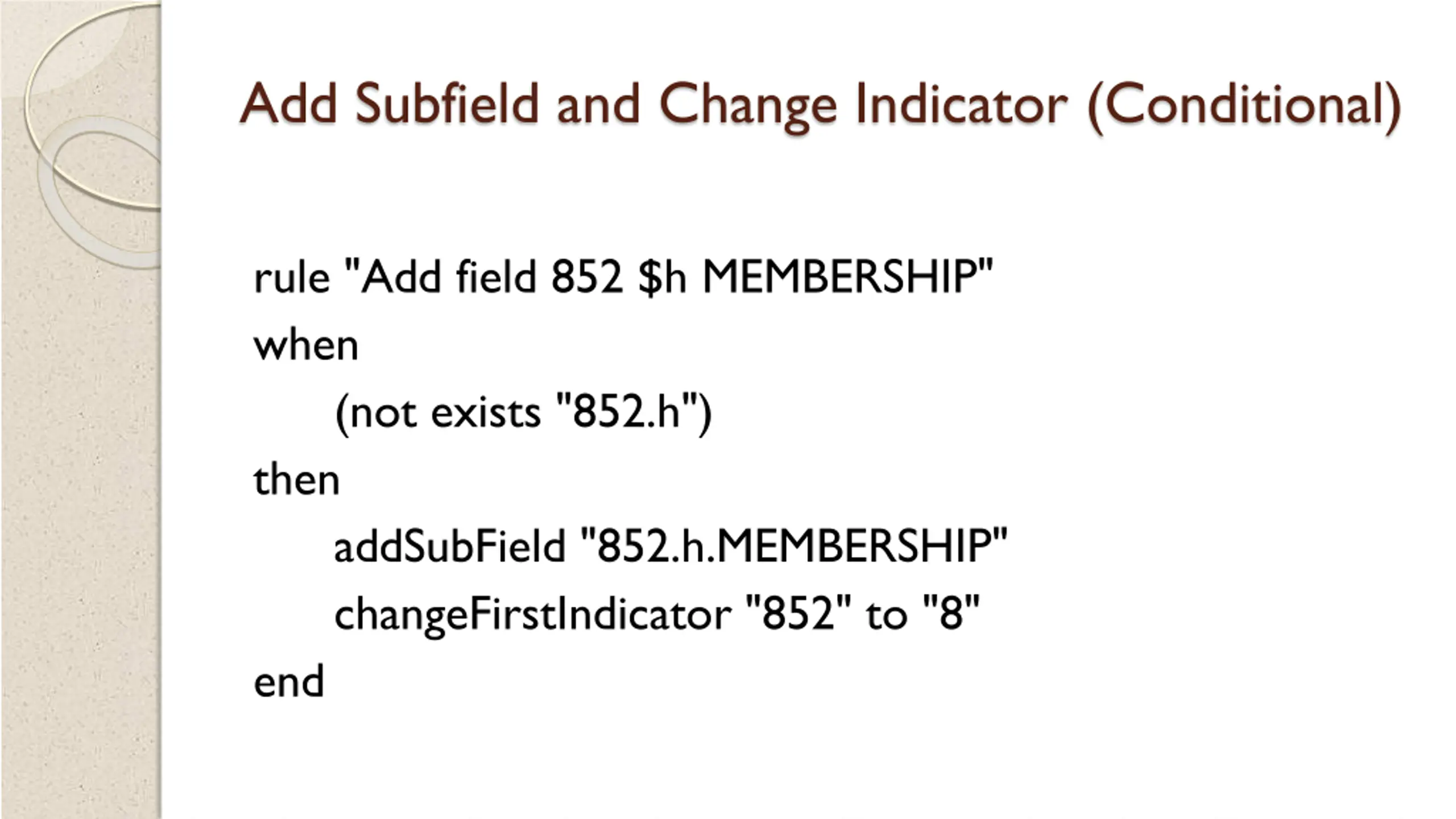 Add Subfield and Change Indicator (Conditional) rule "Add field 852 $h MEMBERSHIP" when (not exists "852.h") then addSubField "852.h.MEMBERSHIP" changeFirstIndicator "852" to "8" end