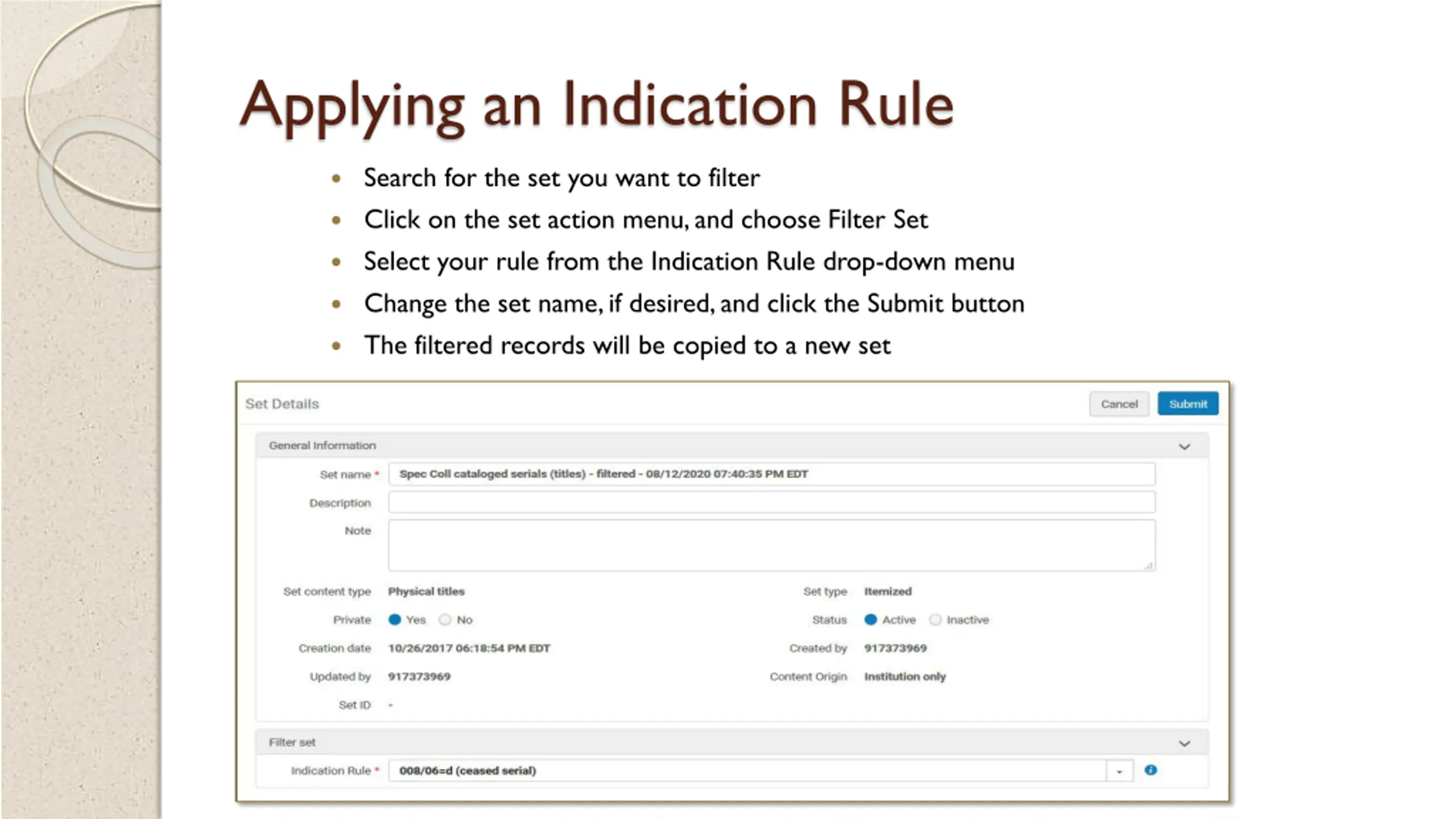 Applying an Indication Rule Search for the set you want to filter Click on the set action menu, and choose Filter Set Select your rule from the Indication Rule drop-down menu Change the set name, if desired, and click the Submit button The filtered records will be copied to a new set