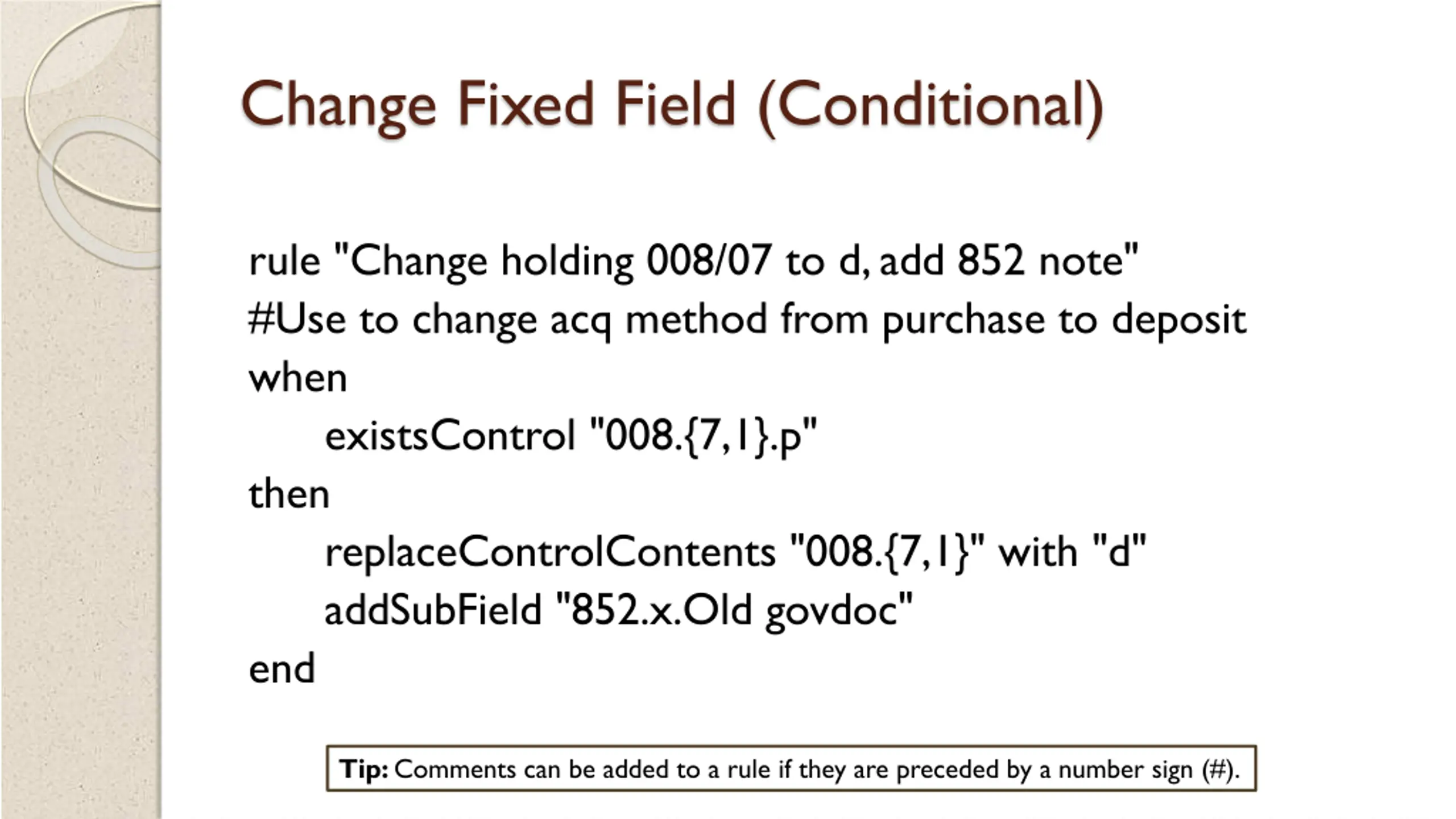 Change Fixed Field (Conditional) rule "Change holding 008/07 to d, add 852 note" #Use to change acq method from purchase to deposit when existsControl "008.{7,1}.p" then replaceControlContents "008.{7,1}" with "d" addSubField "852.x.Old govdoc" end Tip: Comments can be added to a rule if they are preceded by a number sign (#).