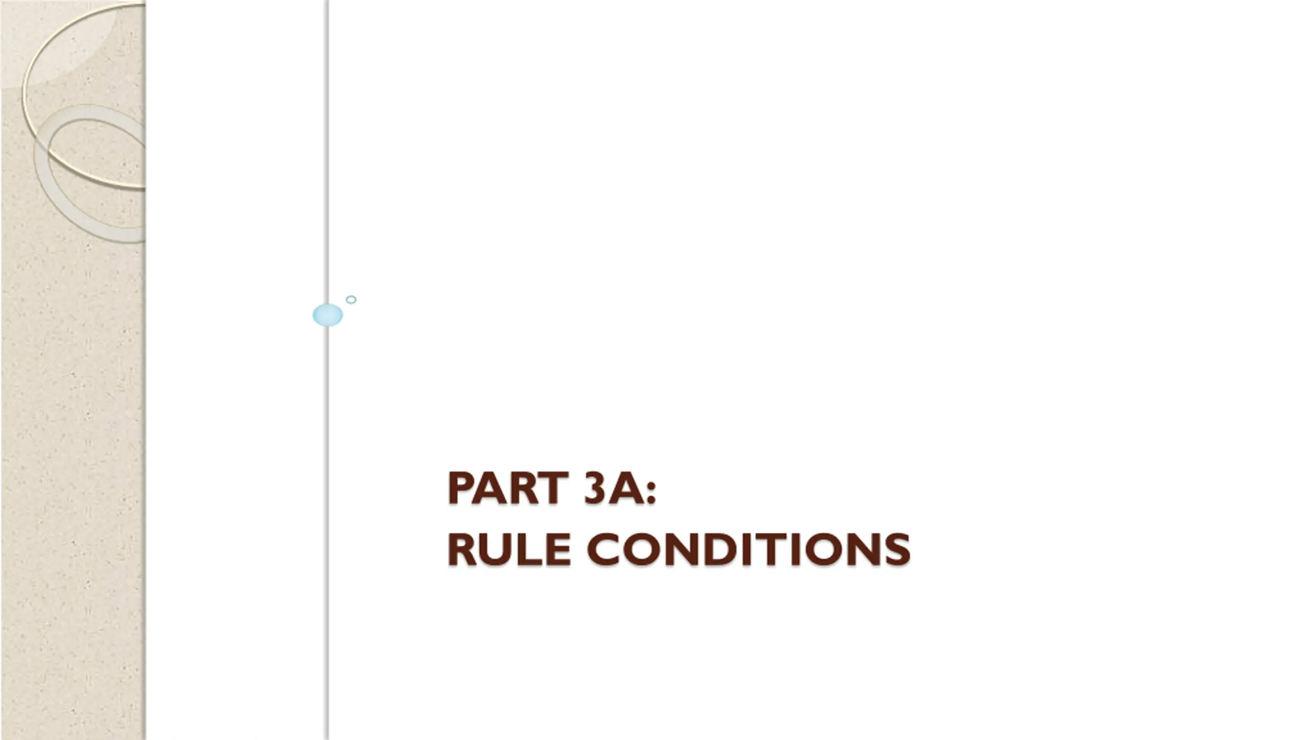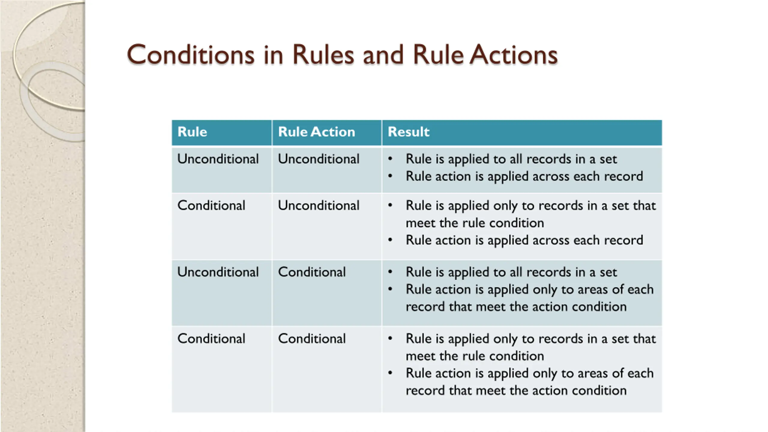 Conditions in Rules and Rule Actions Rule Rule Action Result Unconditional Unconditional Rule is applied to all records in a set Rule action is applied across each record Conditional Unconditional Rule is applied only to records in a set that meet the rule condition Rule action is applied across each record Unconditional Conditional Rule is applied to all records in a set Rule action is applied only to areas of each record that meet the action condition Conditional Conditional Rule is applied only to records in a set that meet the rule condition Rule action is applied only to areas of each record that meet the action condition