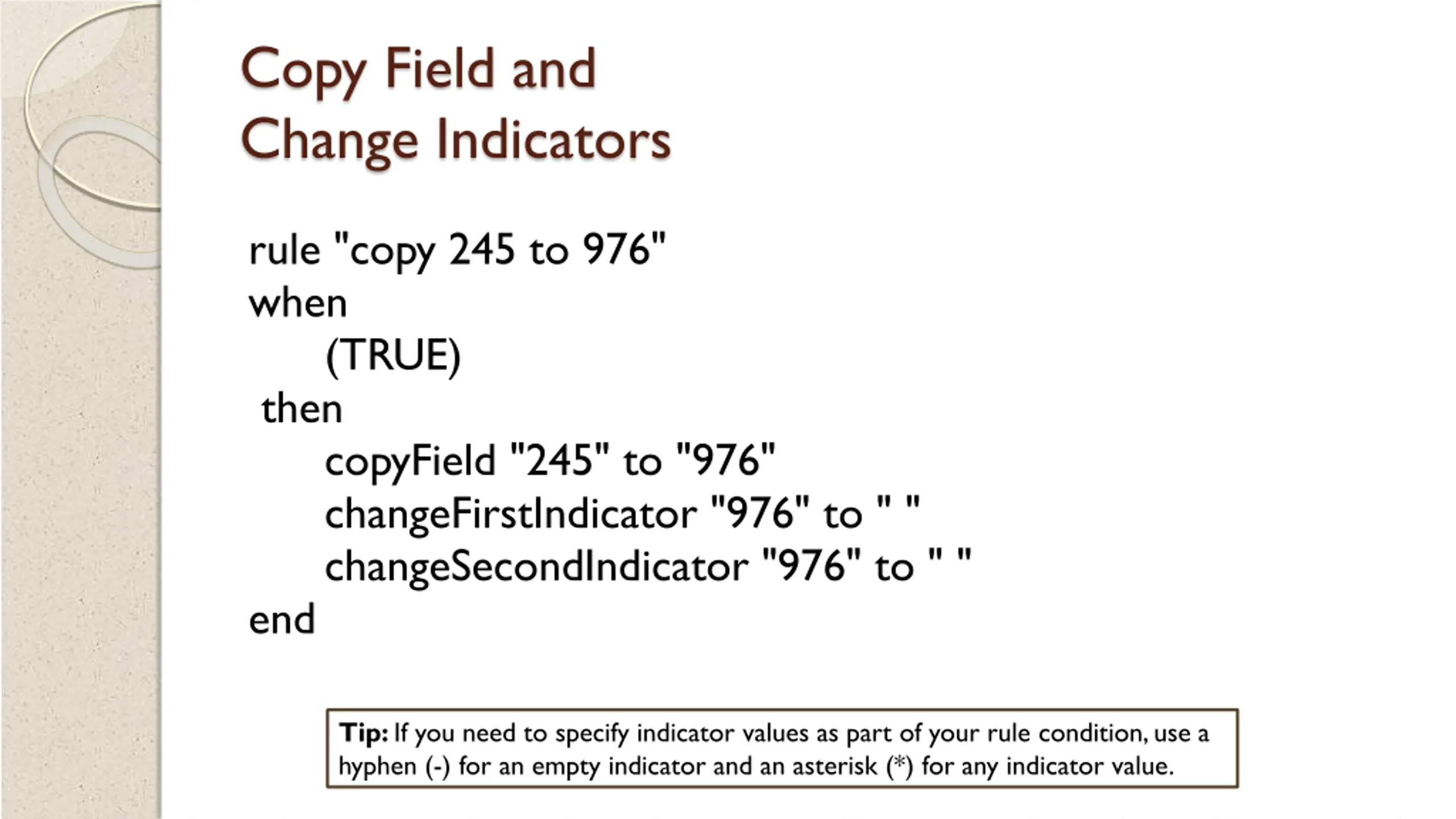 Copy Field and Change Indicators rule "copy 245 to 976" when (TRUE) then copyField "245" to "976" changeFirstIndicator "976" to " " changeSecondIndicator "976" to " " end Tip: If you need to specify indicator values as part of your rule condition, use a hyphen (-) for an empty indicator and an asterisk (*) for any indicator value.