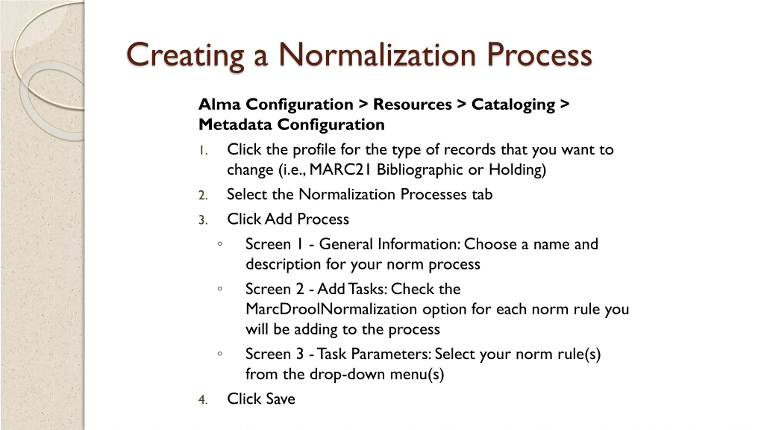 Creating a Normalization Process Alma Configuration > Resources > Cataloging > Metadata Configuration Click the profile for the type of records that you want to change (i.e., MARC21 Bibliographic or Holding) Select the Normalization Processes tab Click Add Process Screen 1 - General Information: Choose a name and description for your norm process Screen 2 - Add Tasks: Check the MarcDroolNormalization option for each norm rule you will be adding to the process Screen 3 - Task Parameters: Select your norm rule(s) from the drop-down menu(s) Click Save 1. 2. 3. 4.