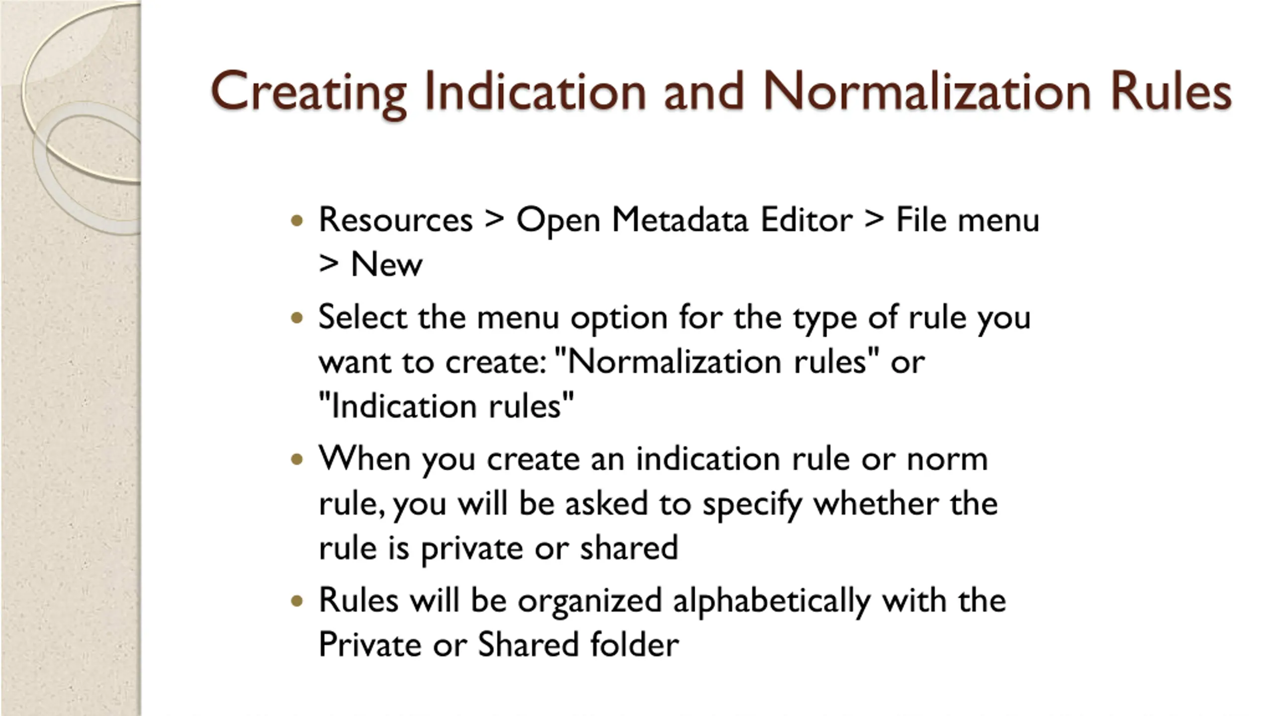 Creating Indication and Normalization Rules Resources > Open Metadata Editor > File menu > New Select the menu option for the type of rule you want to create: "Normalization rules" or "Indication rules" When you create an indication rule or norm rule, you will be asked to specify whether the rule is private or shared Rules will be organized alphabetically with the Private or Shared folder