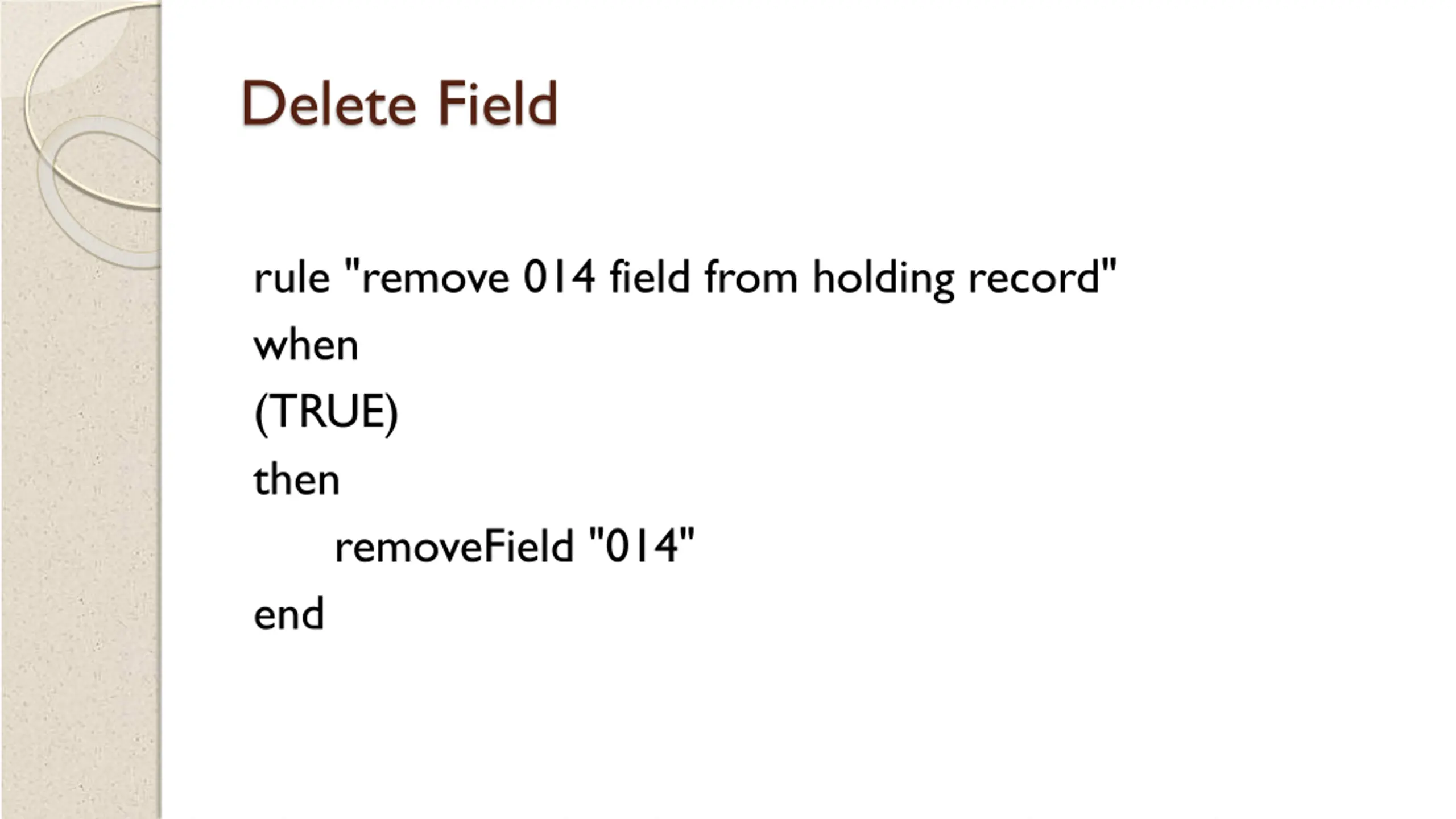 Delete Field rule "remove 014 field from holding record" when (TRUE) then removeField "014" end