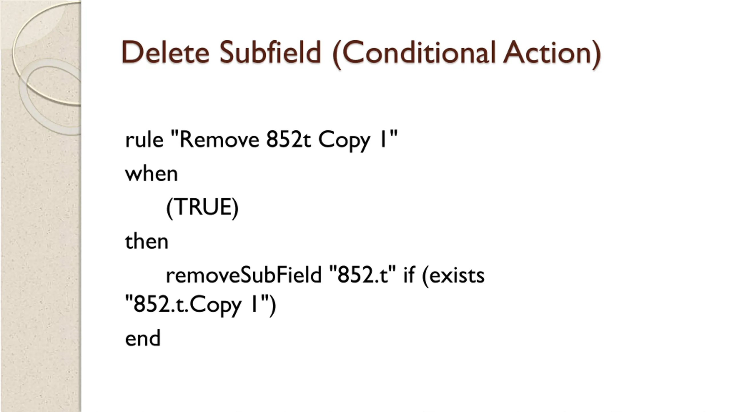 Delete Subfield (Conditional Action) rule "Remove 852t Copy 1" when (TRUE) then removeSubField "852.t" if (exists "852.t.Copy 1") end