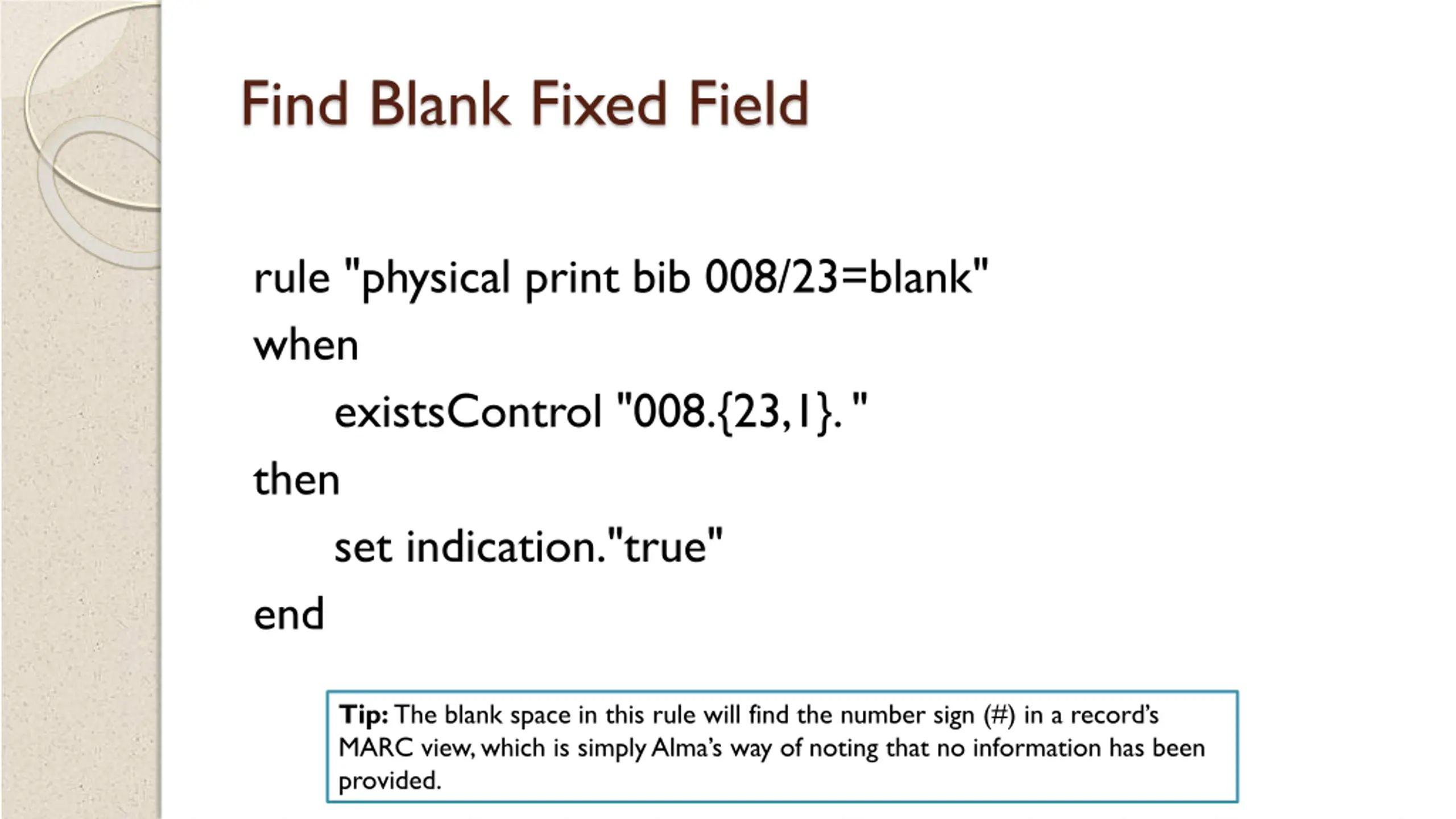Find Blank Fixed Field rule "physical print bib 008/23=blank" when existsControl "008.{23,1}. " then set indication."true" end Tip: The blank space in this rule will find the number sign (#) in a record s MARC view, which is simply Alma s way of noting that no information has been provided.