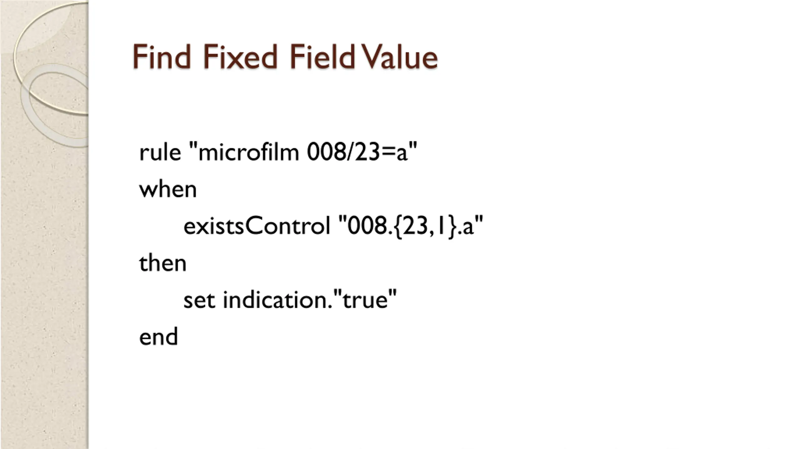 Find Fixed Field Value rule "microfilm 008/23=a" when existsControl "008.{23,1}.a" then set indication."true" end