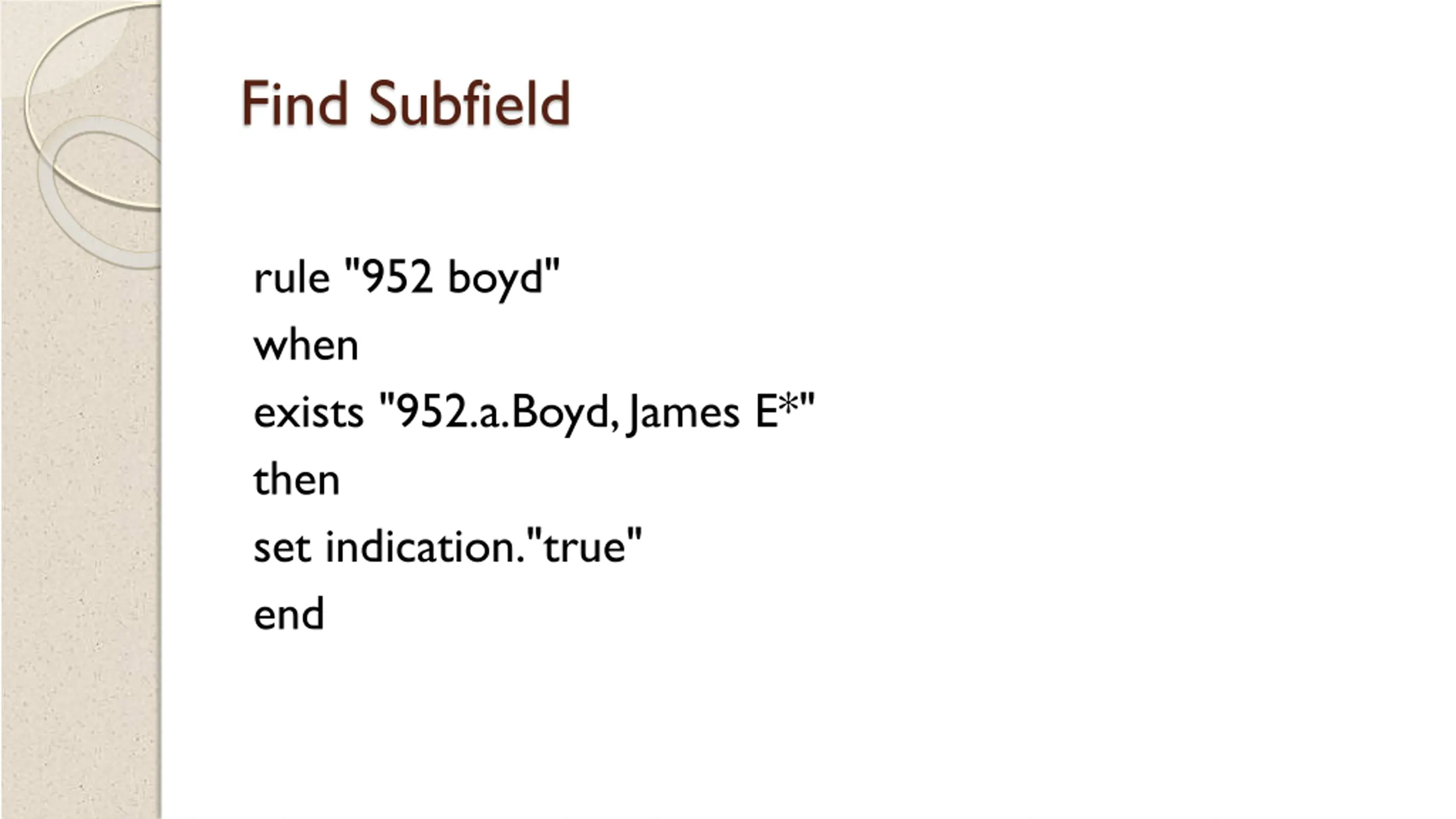 Find Subfield rule "952 boyd" when exists "952.a.Boyd, James E*" then set indication."true" end