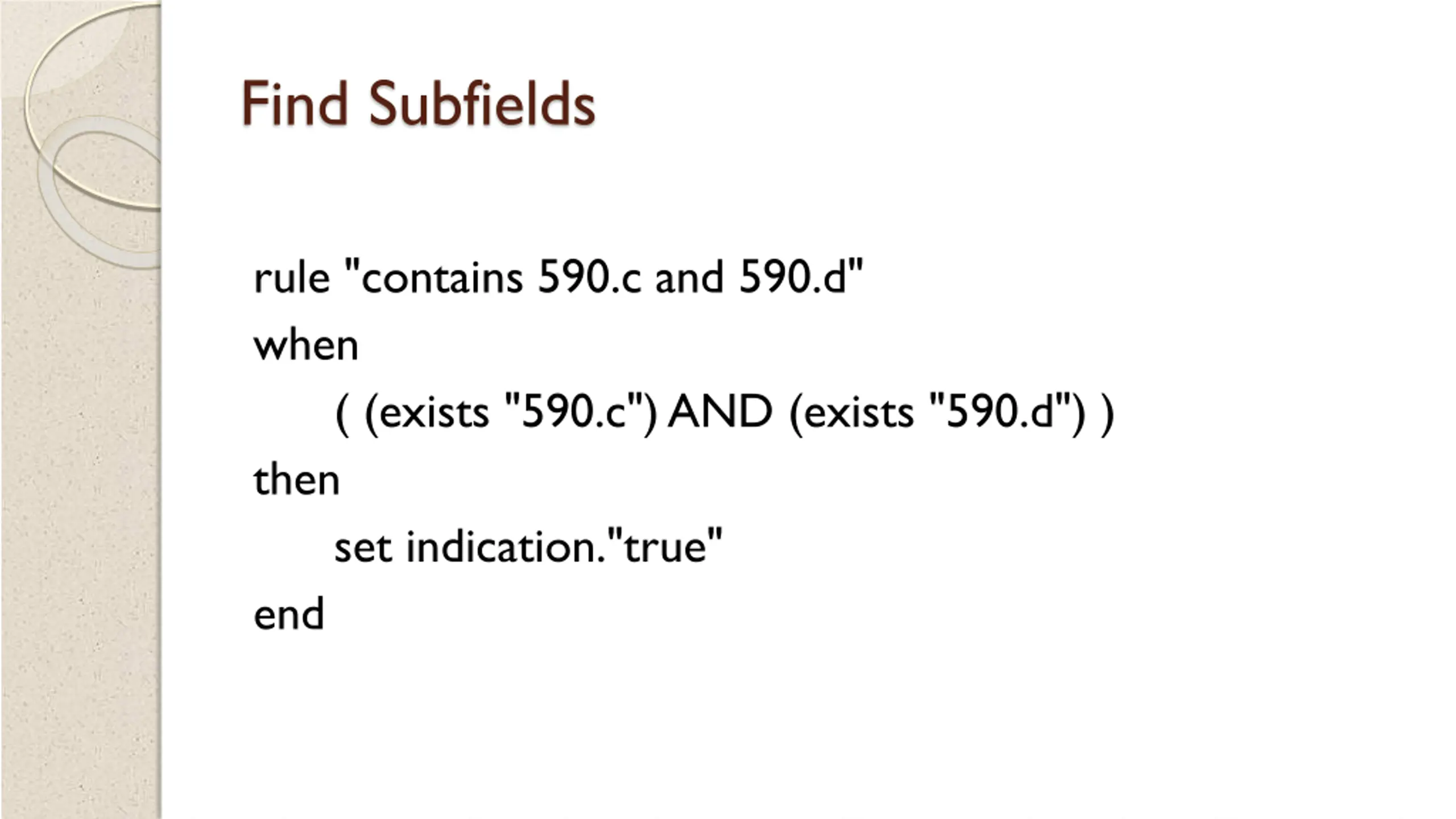 Find Subfields rule "contains 590.c and 590.d" when ( (exists "590.c") AND (exists "590.d") ) then set indication."true" end