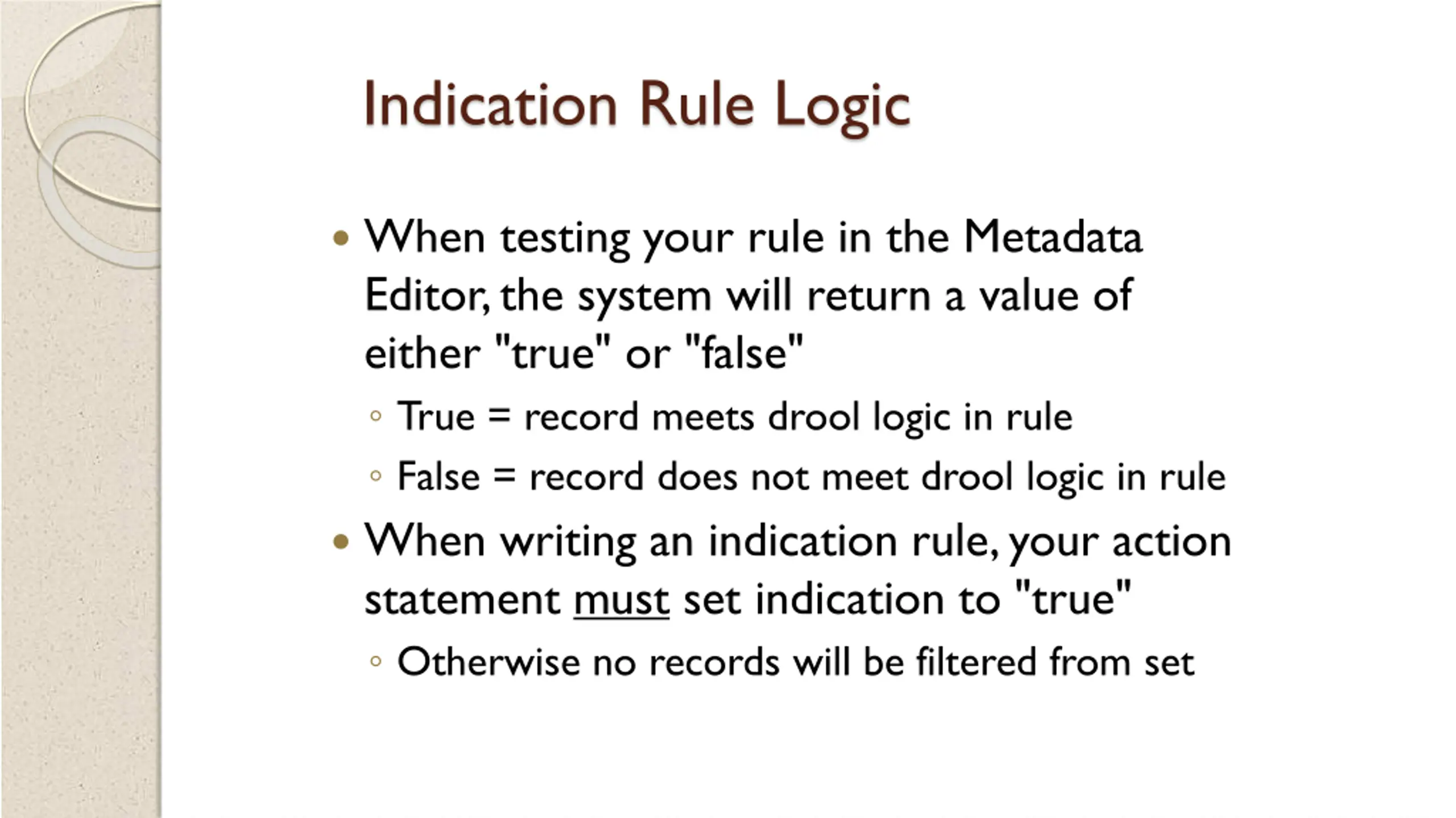 Indication Rule Logic When testing your rule in the Metadata Editor, the system will return a value of either "true" or "false" True = record meets drool logic in rule False = record does notmeet drool logic in rule When writing an indication rule, your action statement must set indication to "true" Otherwise no records will be filtered from set