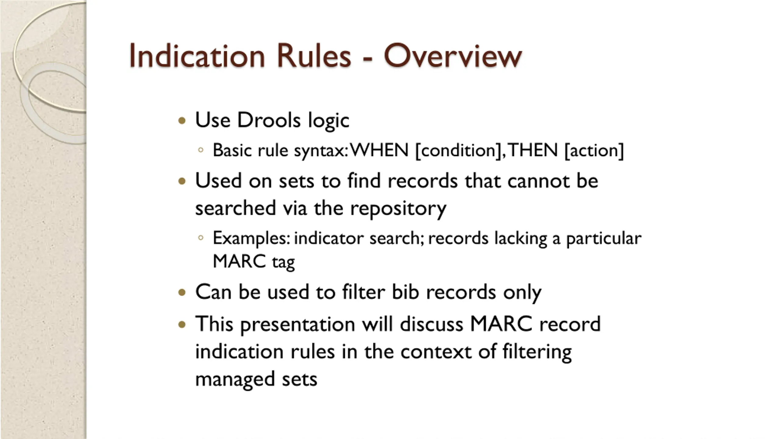 Indication Rules - Overview Use Drools logic Basic rule syntax: WHEN [condition], THEN [action] Used on sets to find records that cannot be searched via the repository Examples: indicator search; records lacking a particular MARC tag Can be used to filter bib records only This presentation will discuss MARC record indication rules in the context of filtering managed sets