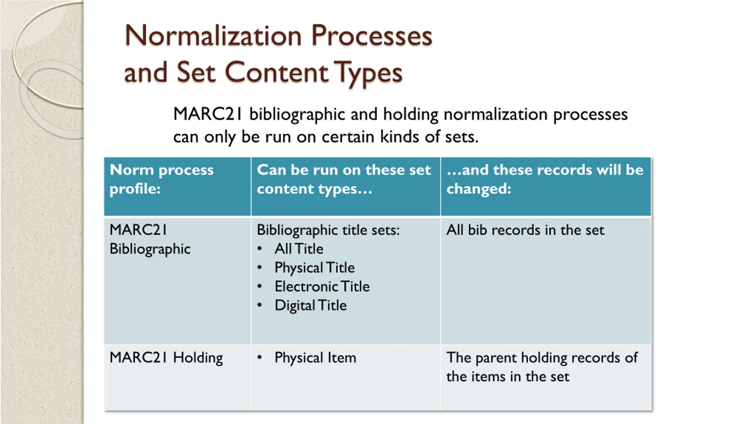 Normalization Processes and Set Content Types MARC21 bibliographic and holding normalization processes can only be run on certain kinds of sets. Norm process profile: Can be run on these set content types and these records will be changed: MARC21 Bibliographic Bibliographic title sets: All Title Physical Title Electronic Title Digital Title All bib records in the set MARC21 Holding Physical Item The parent holding records of the items in the set