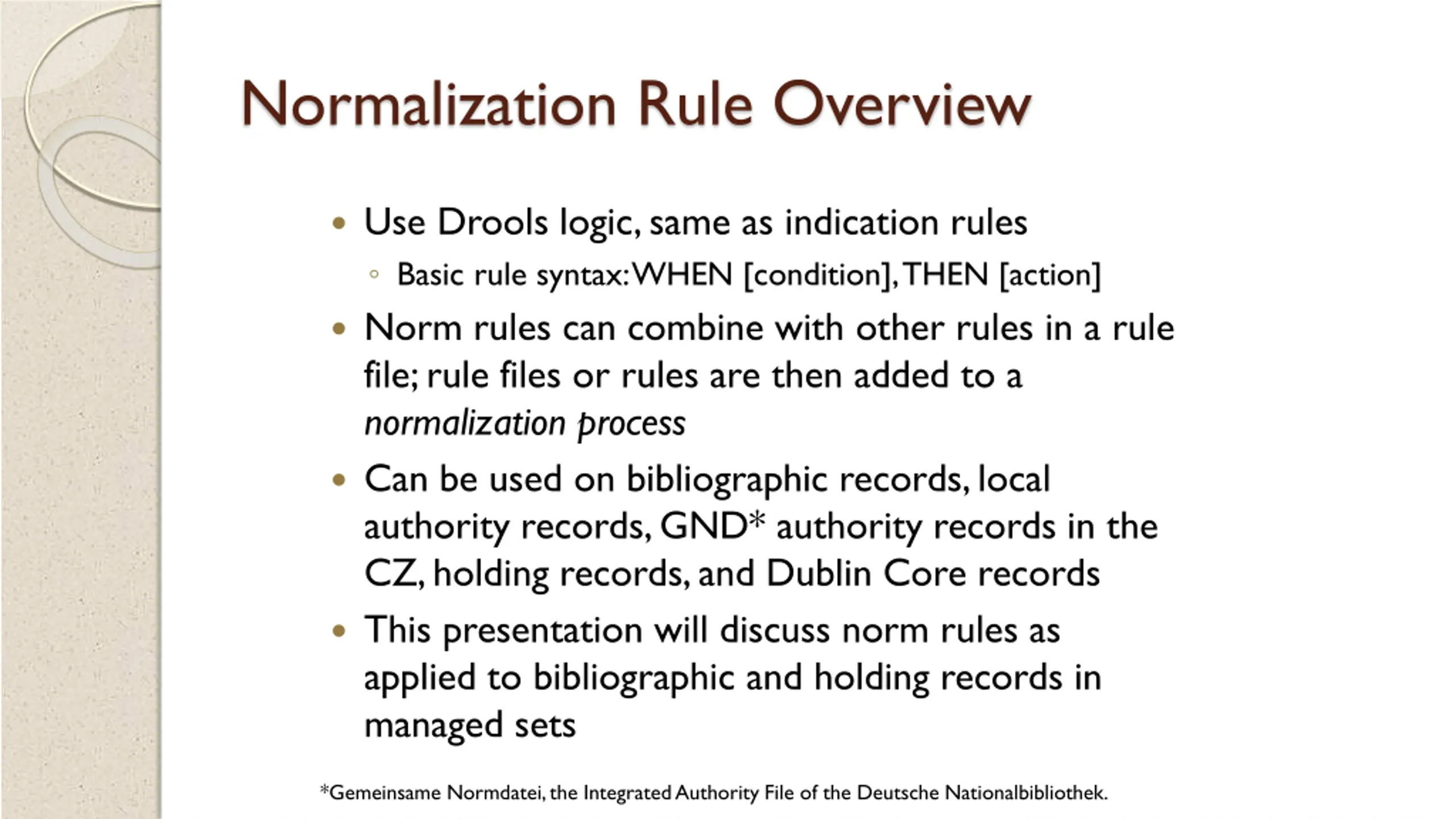 Normalization Rule Overview Use Drools logic, same as indication rules Basic rule syntax: WHEN [condition], THEN [action] Norm rules can combine with other rules in a rule file; rule files or rules are then added to a normalization process Can be used on bibliographic records, local authority records, GND* authority records in the CZ, holding records, and Dublin Core records This presentation will discuss norm rules as applied to bibliographic and holding records in managed sets *Gemeinsame Normdatei, the Integrated Authority File of the Deutsche Nationalbibliothek.