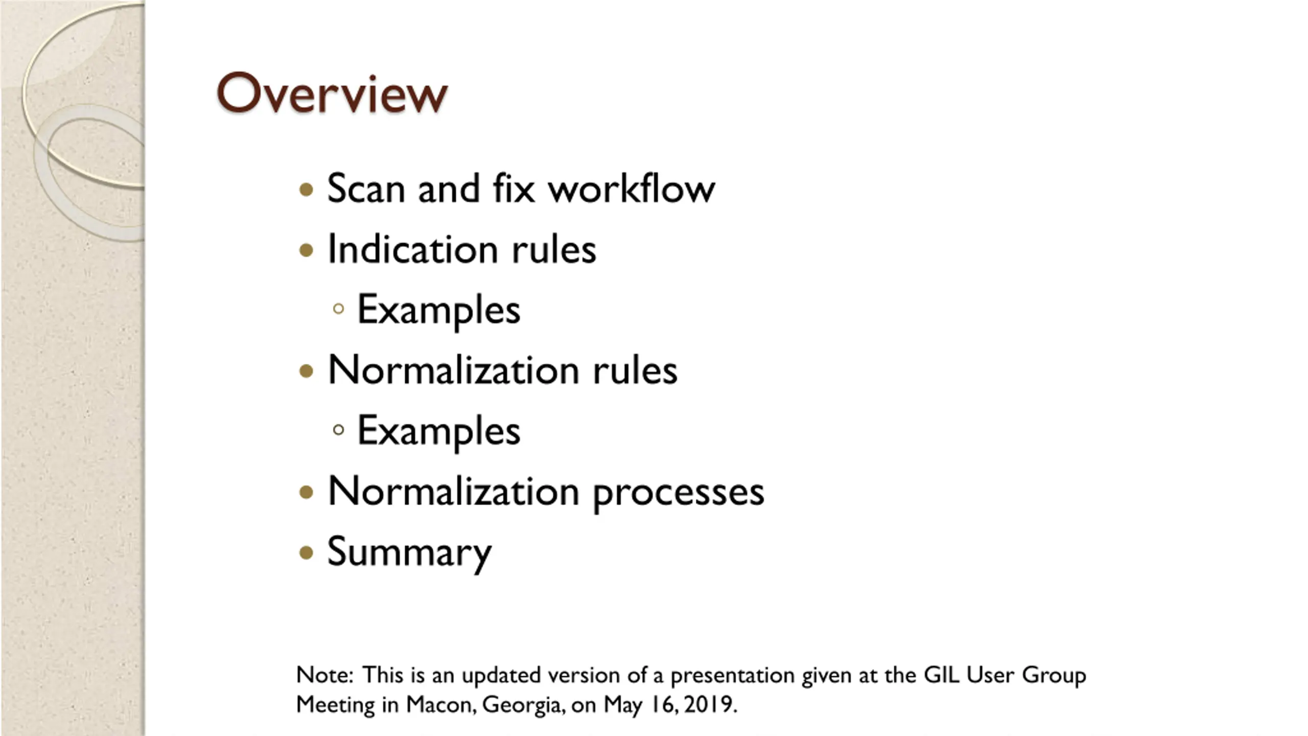 Overview Scan and fix workflow Indication rules Examples Normalization rules Examples Normalization processes Summary Note: This is an updated version of a presentation given at the GIL User Group Meeting in Macon, Georgia, on May 16, 2019.