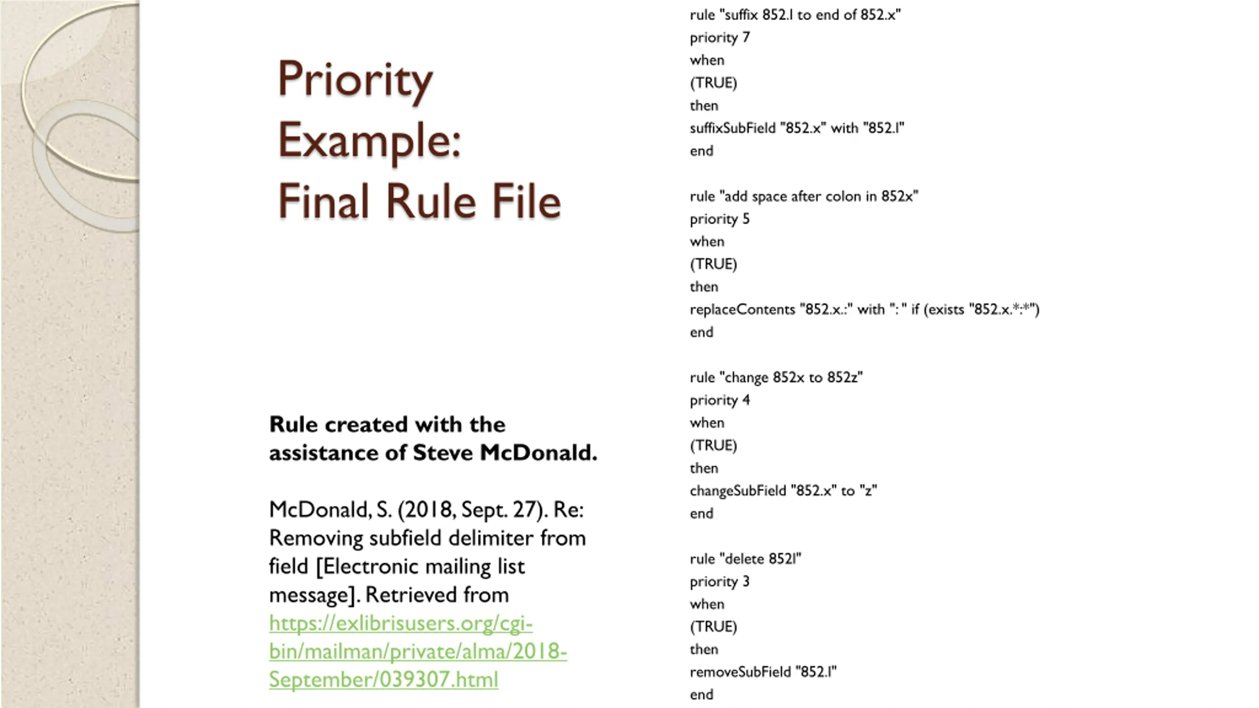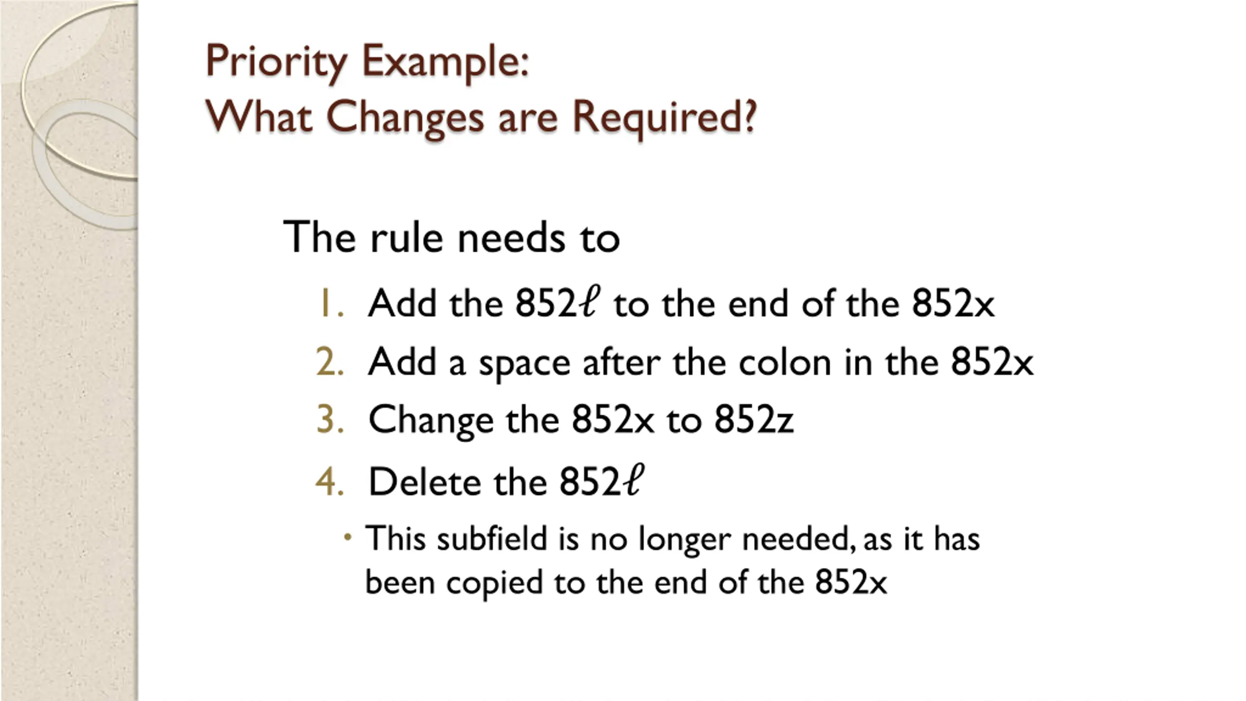 Priority Example: What Changes are Required? The rule needs to 1. Add the 852 to the end of the 852x 2. Add a space after the colon in the 852x 3. Change the 852x to 852z 4. Delete the 852 This subfield is no longer needed, as it has been copied to the end of the 852x
