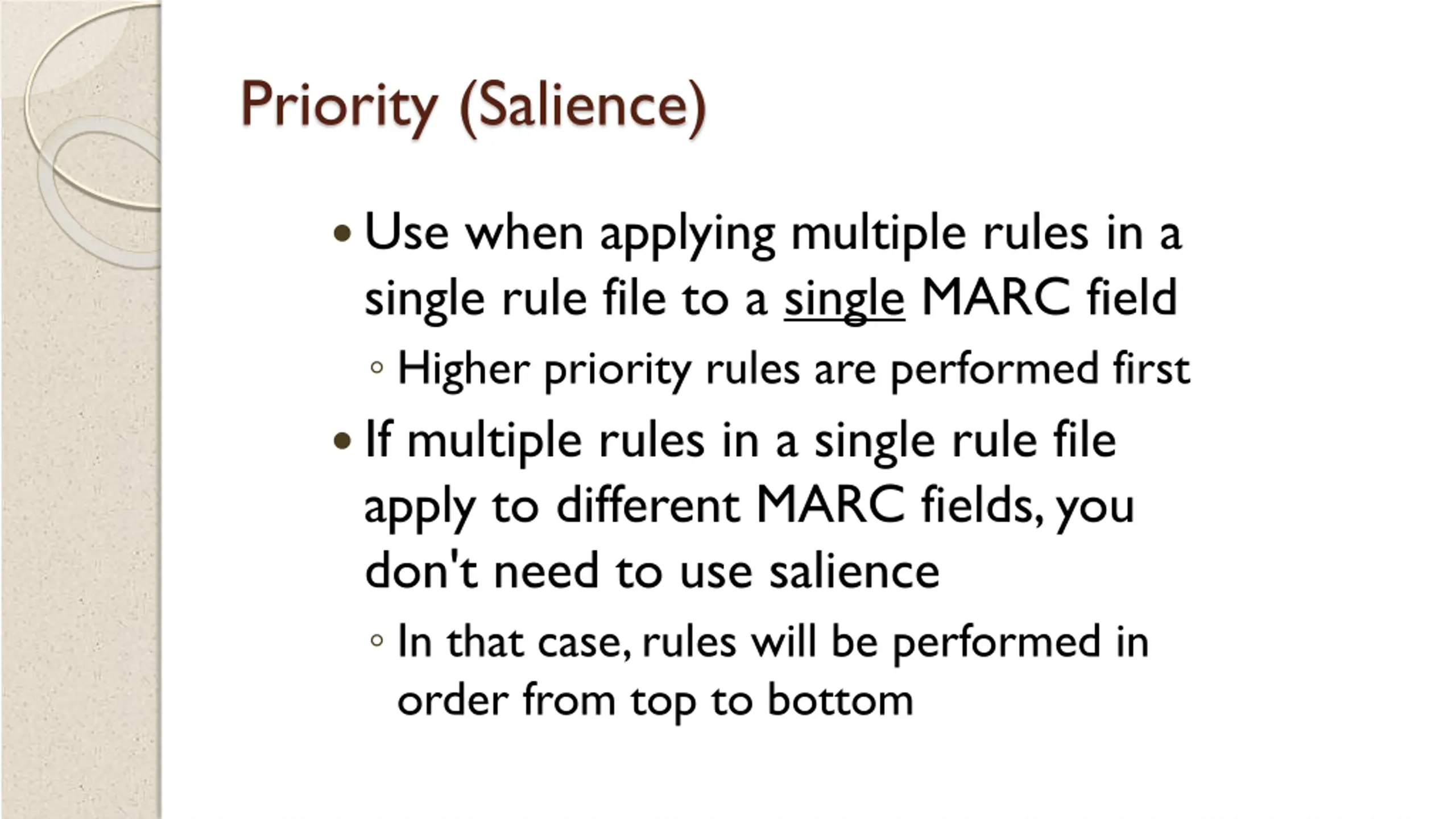 Priority (Salience) Use when applying multiple rules in a single rule file to a single MARC field Higher priority rules are performed first If multiple rules in a single rule file apply to different MARC fields, you don't need to use salience In that case, rules will be performed in order from top to bottom