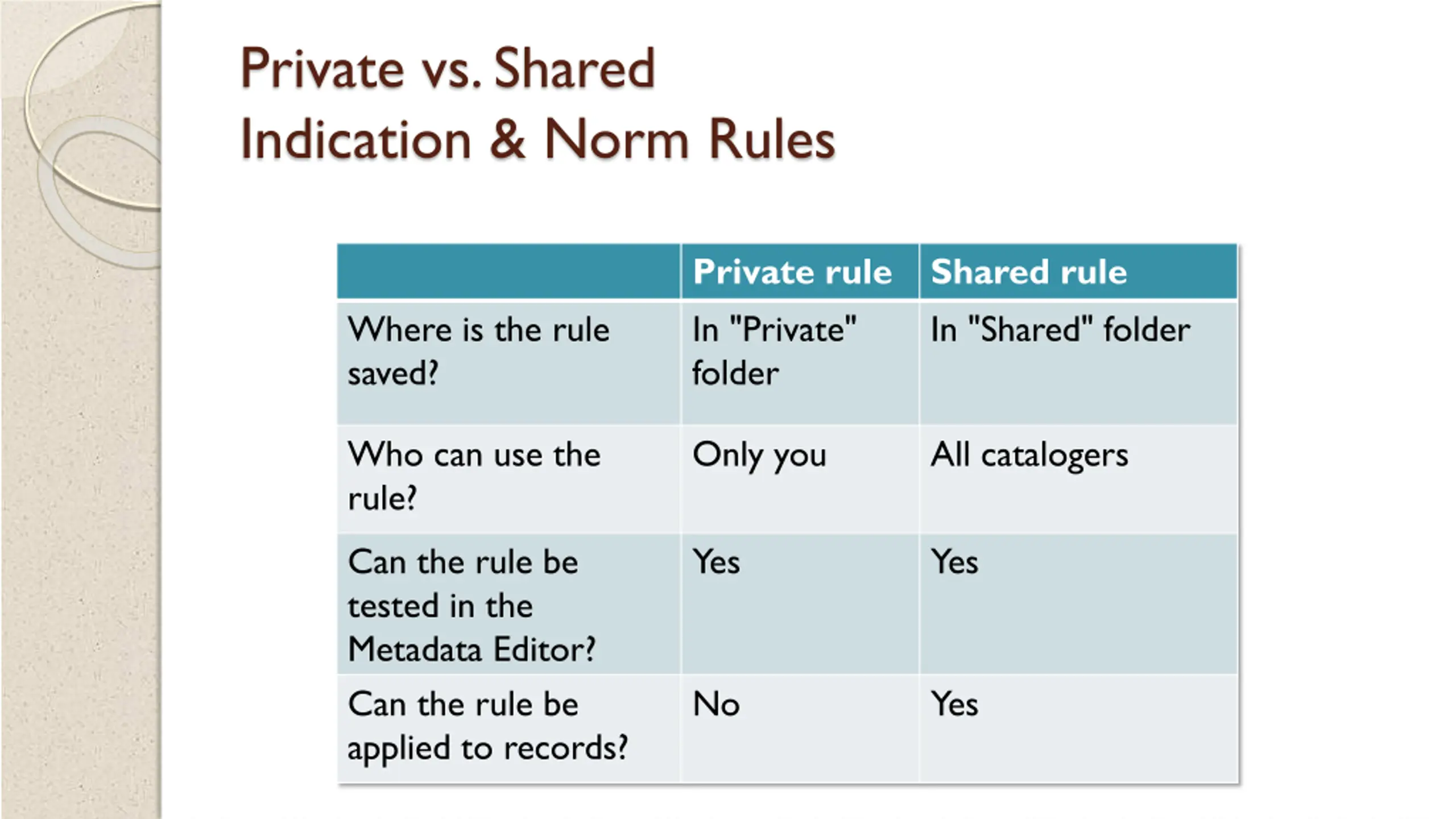 Private vs. Shared Indication & Norm Rules Private rule In "Private" folder Shared rule In "Shared" folder Where is the rule saved? Who can use the rule? Only you All catalogers Can the rule be tested in the Metadata Editor? Can the rule be applied to records? Yes Yes No Yes