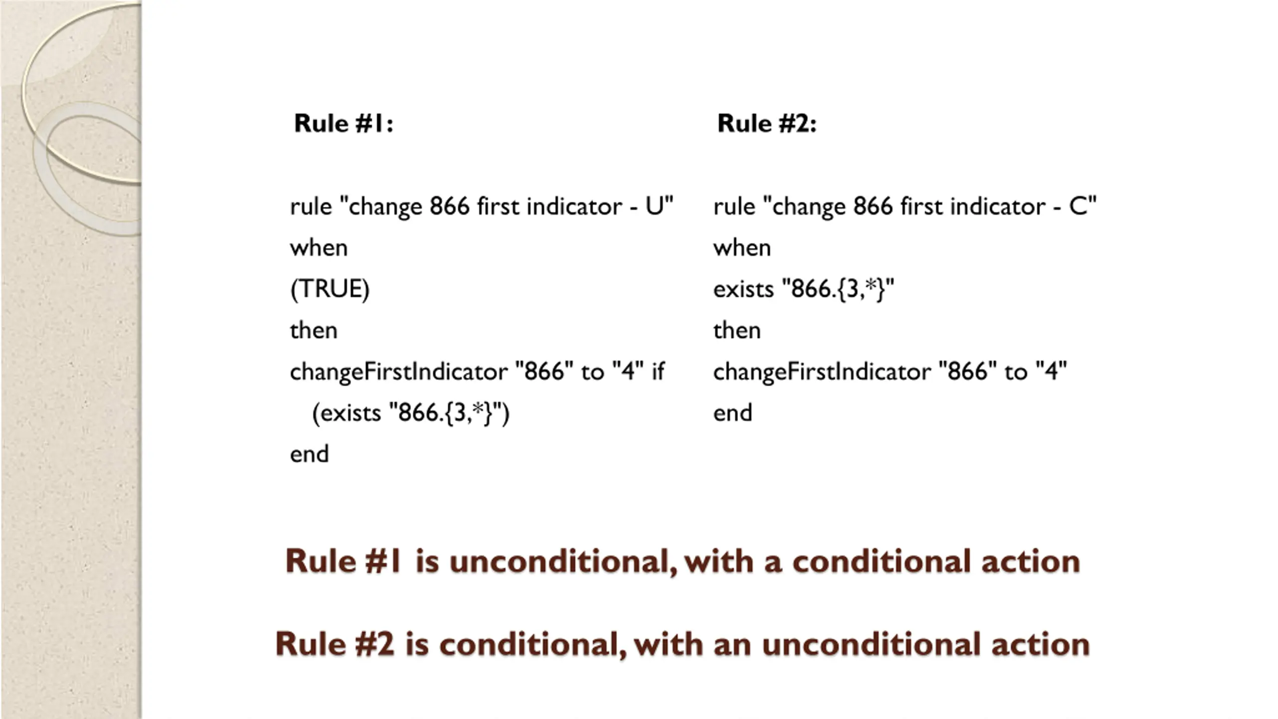 Rule #1: Rule #2: rule "change 866 first indicator - U" when (TRUE) then changeFirstIndicator "866" to "4" if (exists "866.{3,*}") end rule "change 866 first indicator - C" when exists "866.{3,*}" then changeFirstIndicator "866" to "4" end Rule #1 is unconditional, with a conditional action Rule #2 is conditional, with an unconditional action