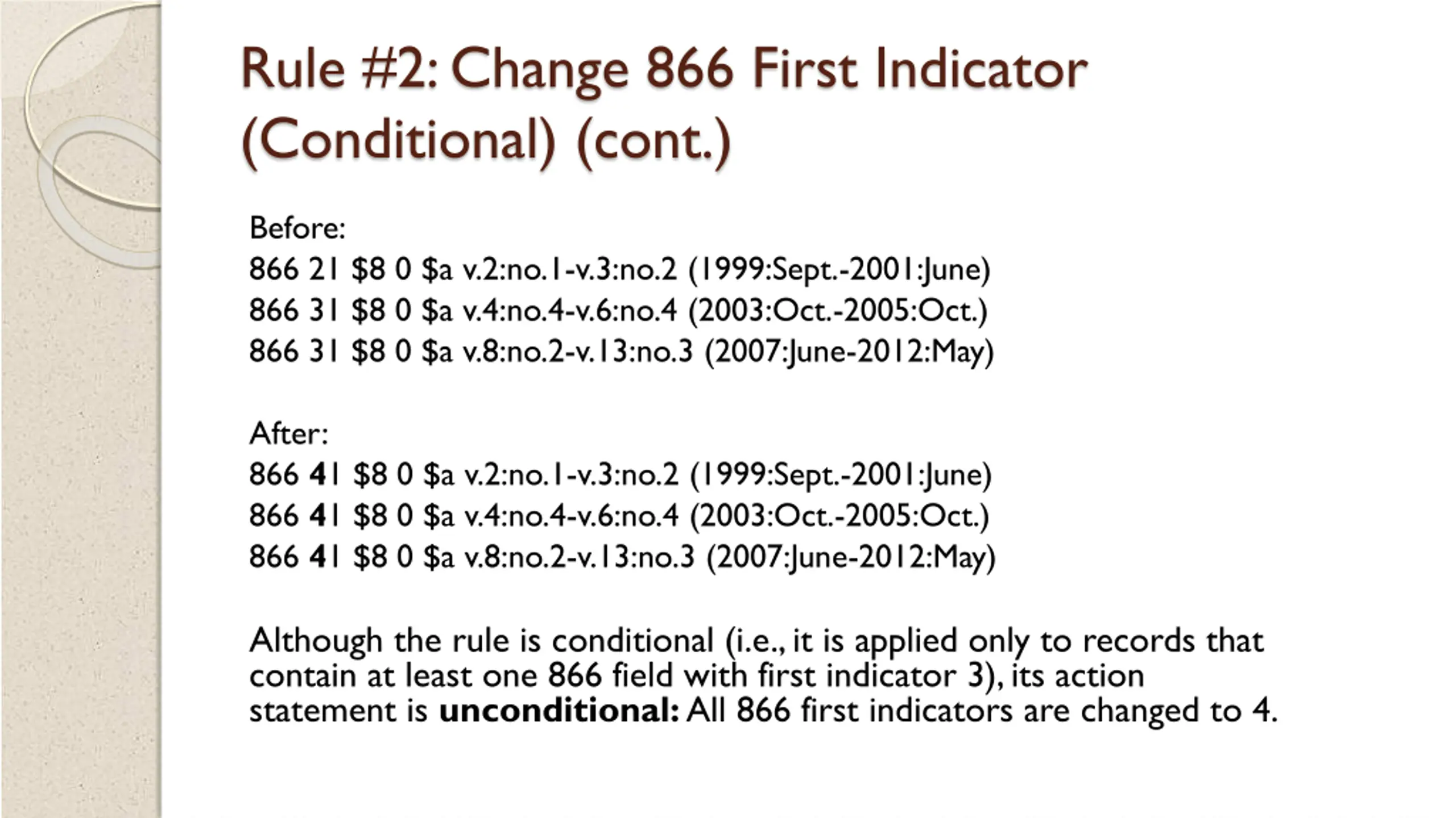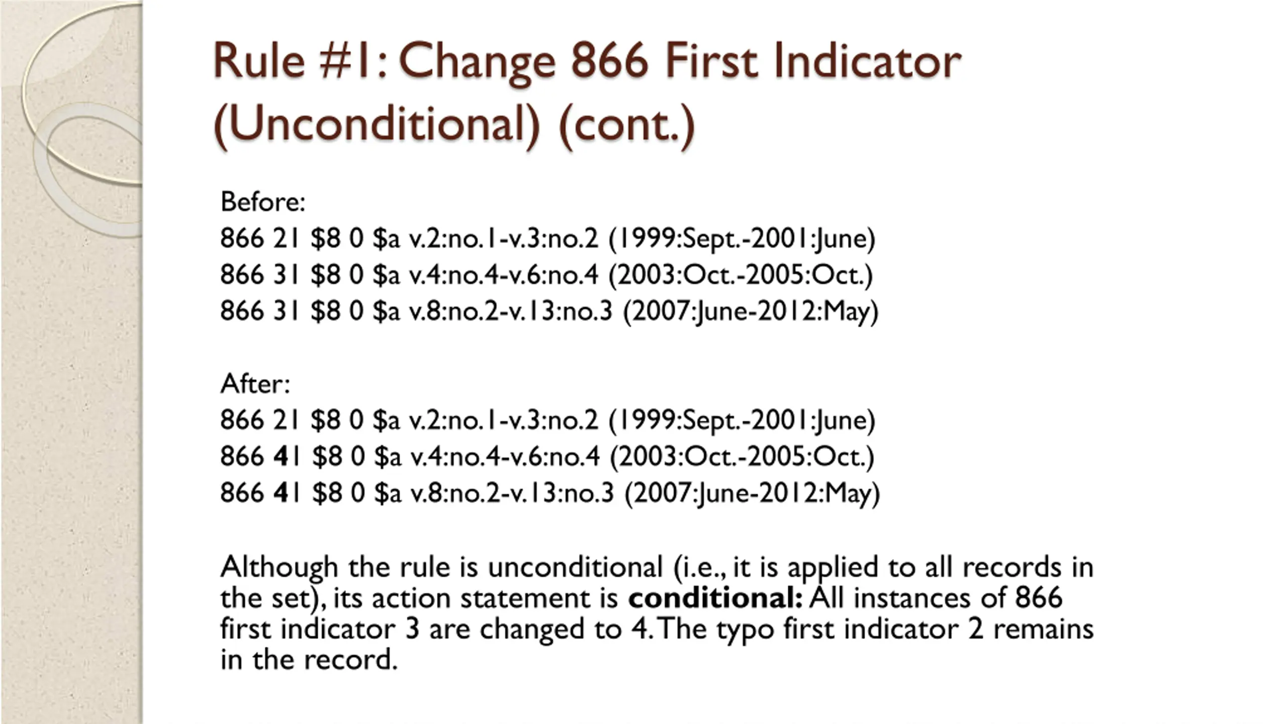 Rule #1: Change 866 First Indicator (Unconditional) (cont.) Before: 866 21 $8 0 $a v.2:no.1-v.3:no.2 (1999:Sept.-2001:June) 866 31 $8 0 $a v.4:no.4-v.6:no.4 (2003:Oct.-2005:Oct.) 866 31 $8 0 $a v.8:no.2-v.13:no.3 (2007:June-2012:May) After: 866 21 $8 0 $a v.2:no.1-v.3:no.2 (1999:Sept.-2001:June) 866 41 $8 0 $a v.4:no.4-v.6:no.4 (2003:Oct.-2005:Oct.) 866 41 $8 0 $a v.8:no.2-v.13:no.3 (2007:June-2012:May) Although the rule is unconditional (i.e., it is applied to all records in the set), its action statement is conditional: All instances of 866 first indicator 3 are changed to 4. The typo first indicator 2 remains in the record.