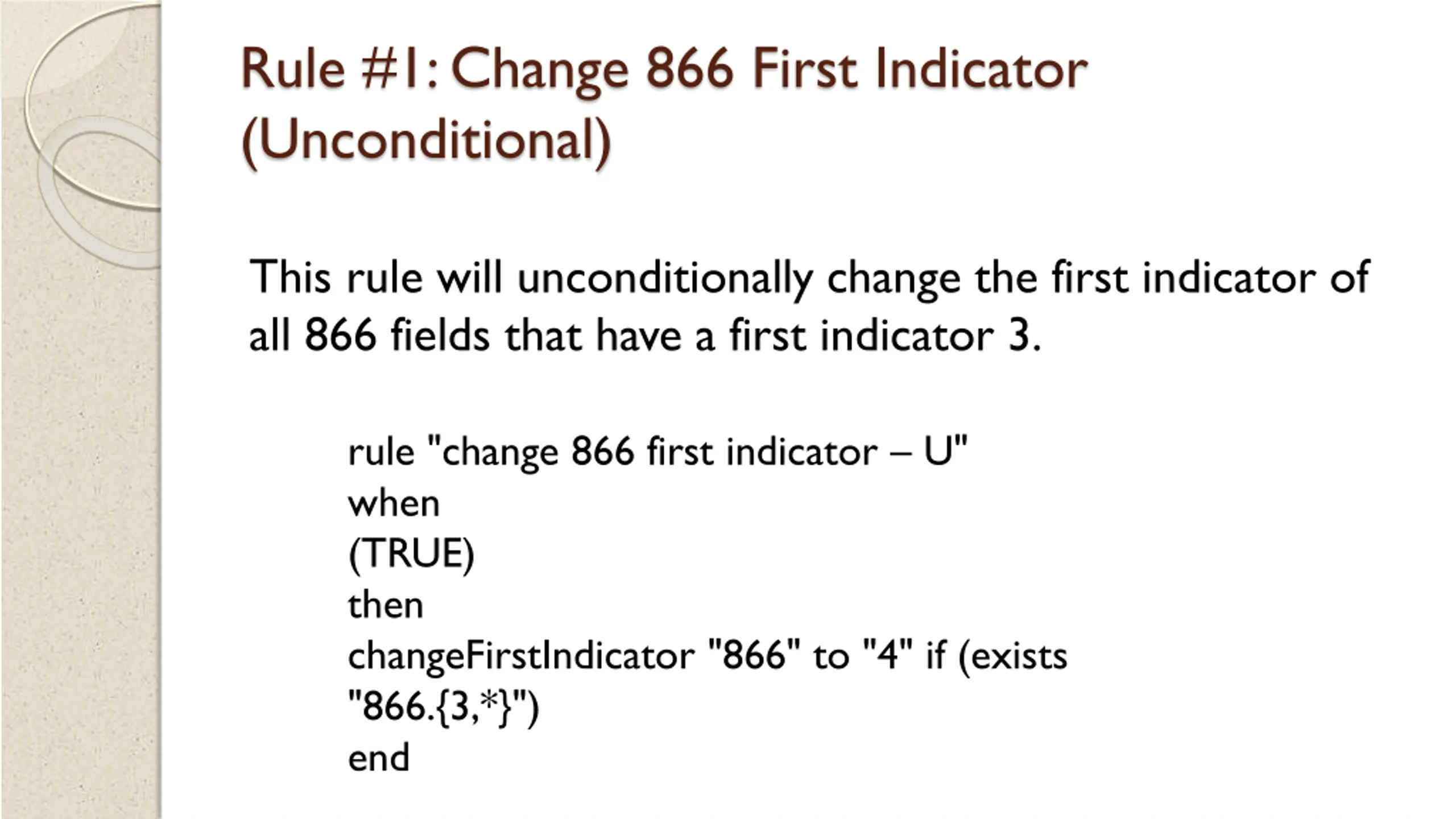 Rule #1: Change 866 First Indicator (Unconditional) This rule will unconditionally change the first indicator of all 866 fields that have a first indicator 3. rule "change 866 first indicator U" when (TRUE) then changeFirstIndicator "866" to "4" if (exists "866.{3,*}") end