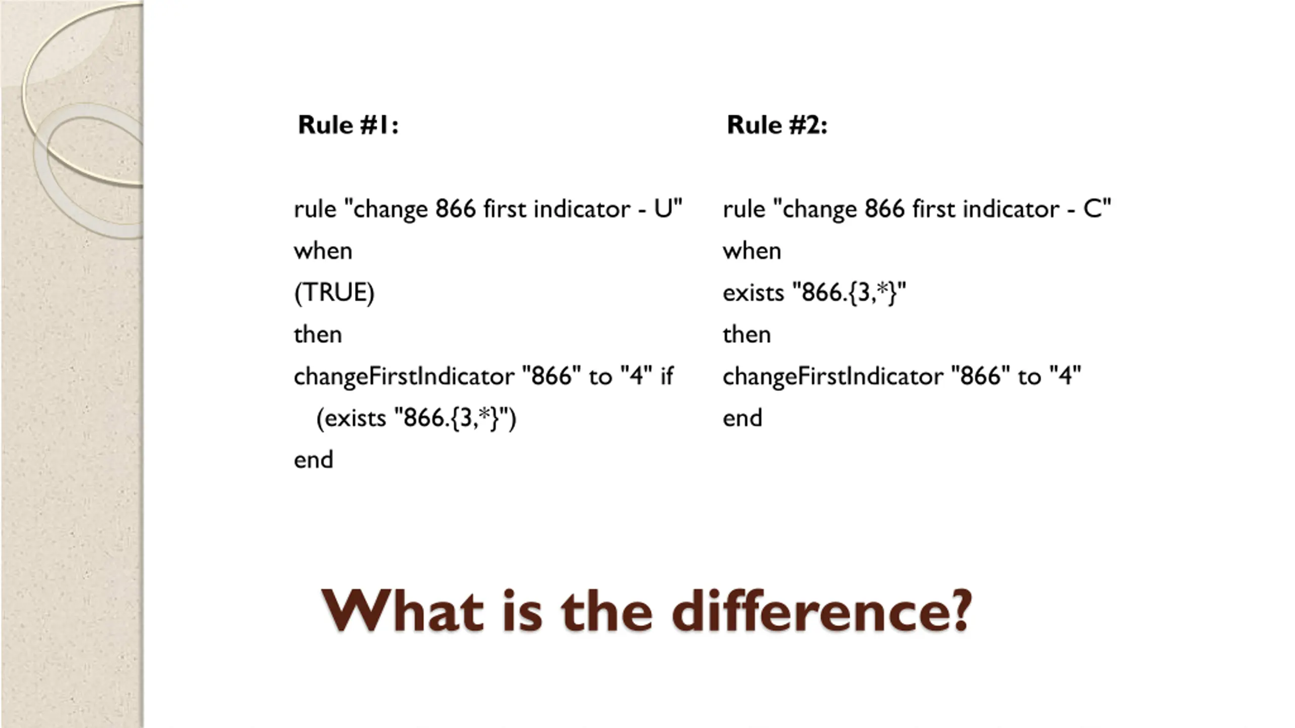 Rule #1: Rule #2: rule "change 866 first indicator - U" when (TRUE) then changeFirstIndicator "866" to "4" if (exists "866.{3,*}") end rule "change 866 first indicator - C" when exists "866.{3,*}" then changeFirstIndicator "866" to "4" end What is the difference?