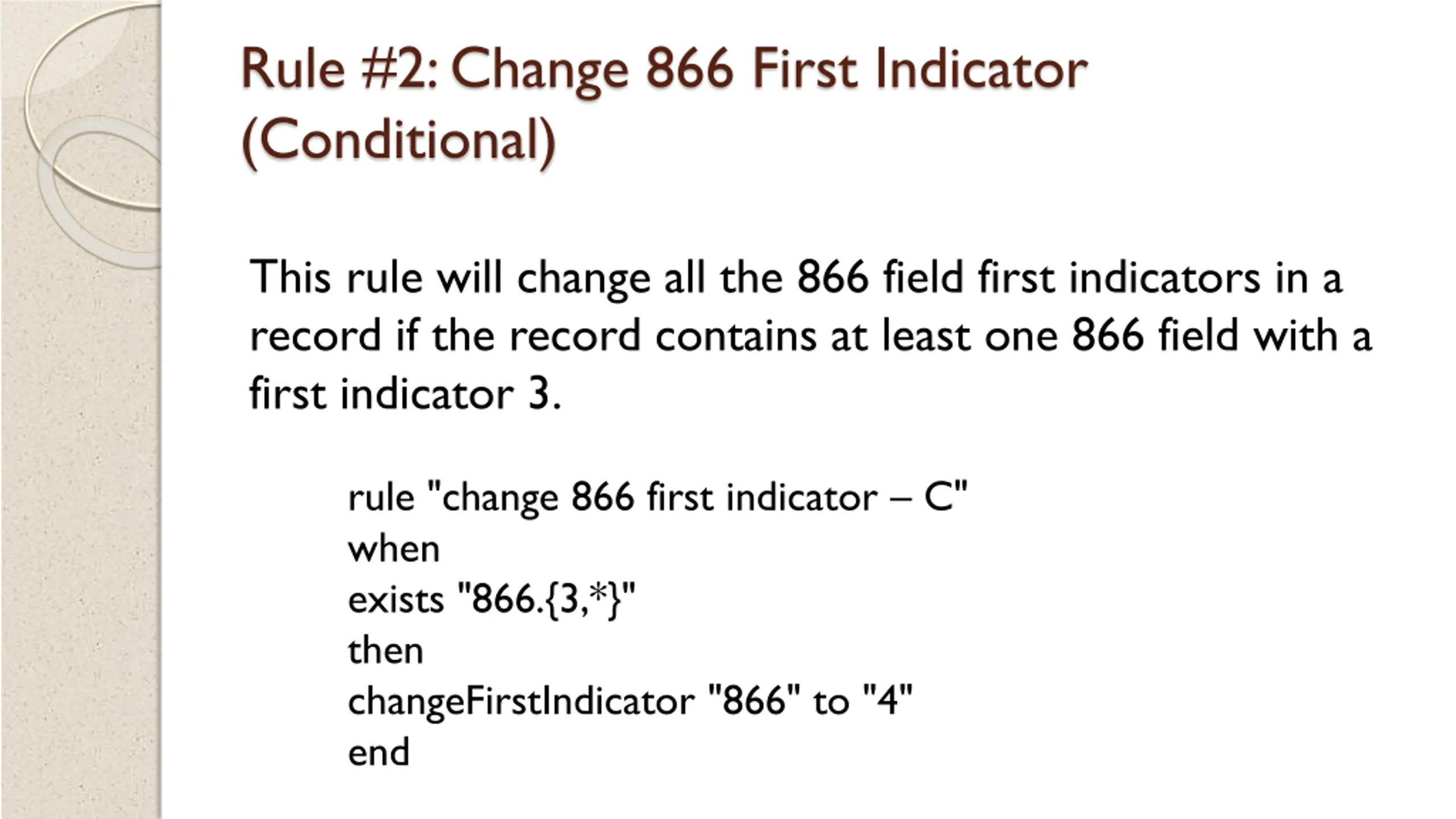 Rule #2: Change 866 First Indicator (Conditional) This rule will change all the 866 field first indicators in a record if the record contains at least one 866 field with a first indicator 3. rule "change 866 first indicator C" when exists "866.{3,*}" then changeFirstIndicator "866" to "4" end