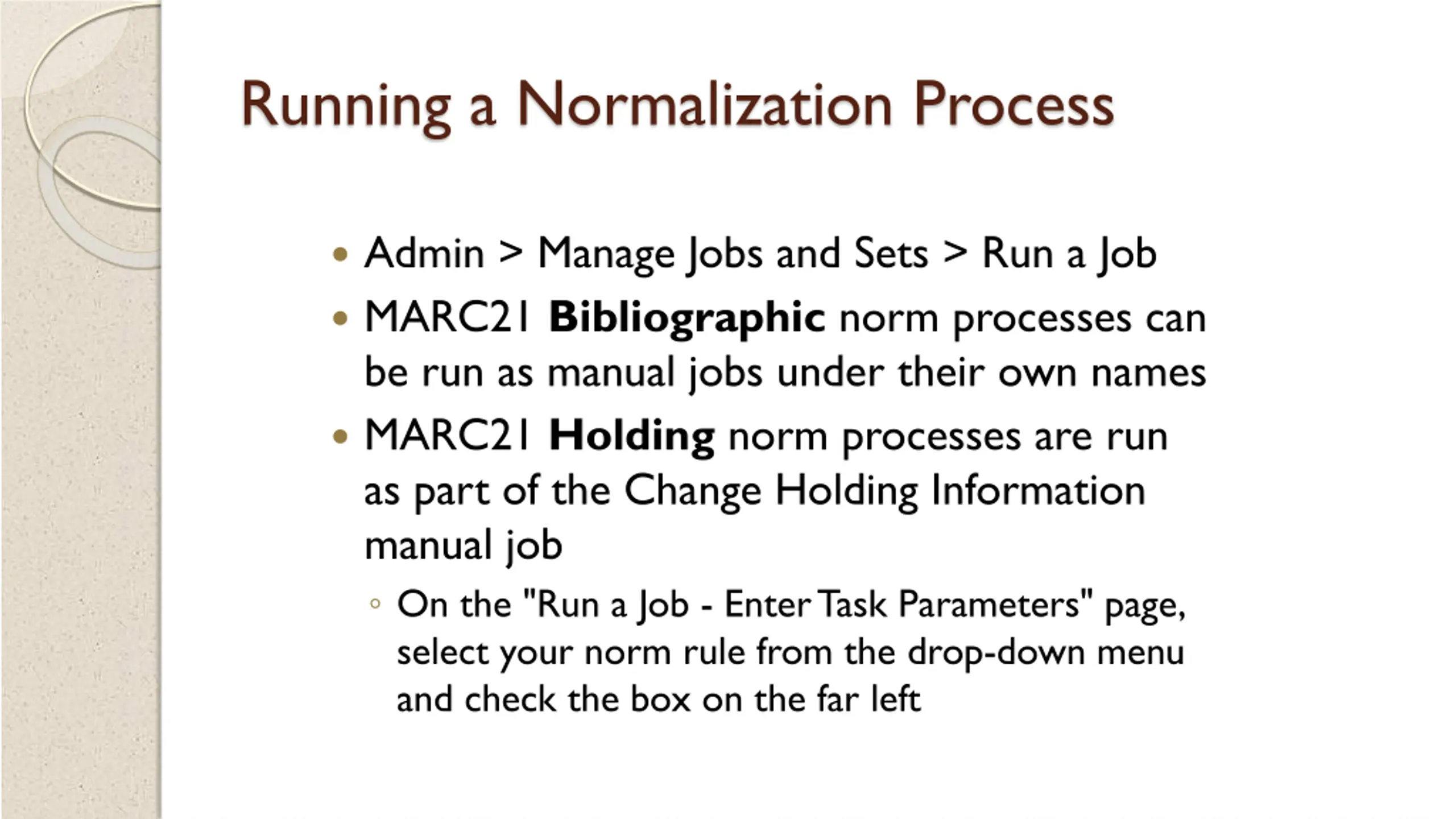 Running a Normalization Process Admin > Manage Jobs and Sets > Run a Job MARC21 Bibliographic norm processes can be run as manual jobs under their own names MARC21 Holding norm processes are run as part of the Change Holding Information manual job On the "Run a Job - Enter Task Parameters" page, select your norm rule from the drop-down menu and check the box on the far left