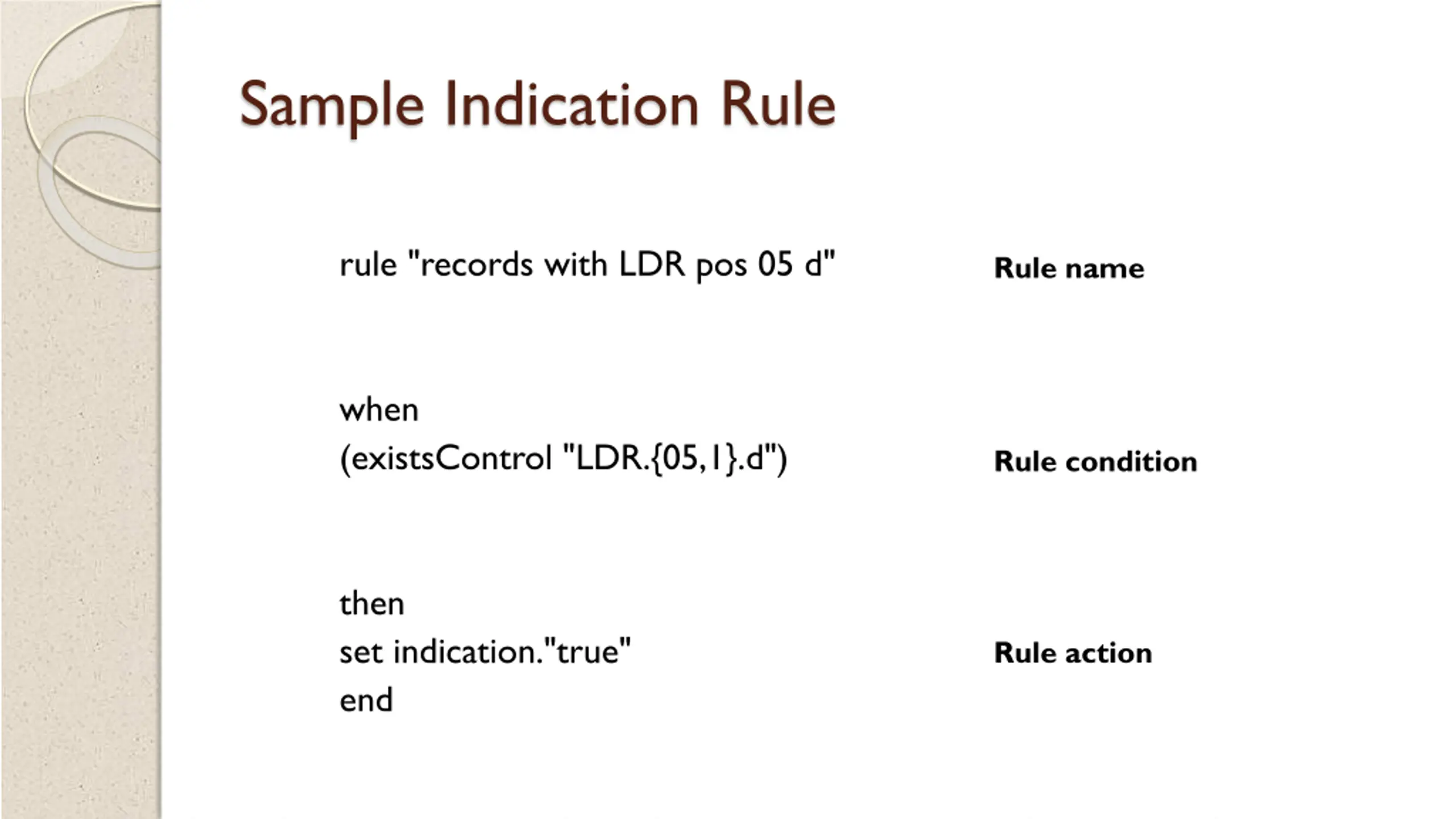 Sample Indication Rule rule "records with LDR pos 05 d" Rule name when (existsControl "LDR.{05,1}.d") Rule condition then set indication."true" end Rule action
