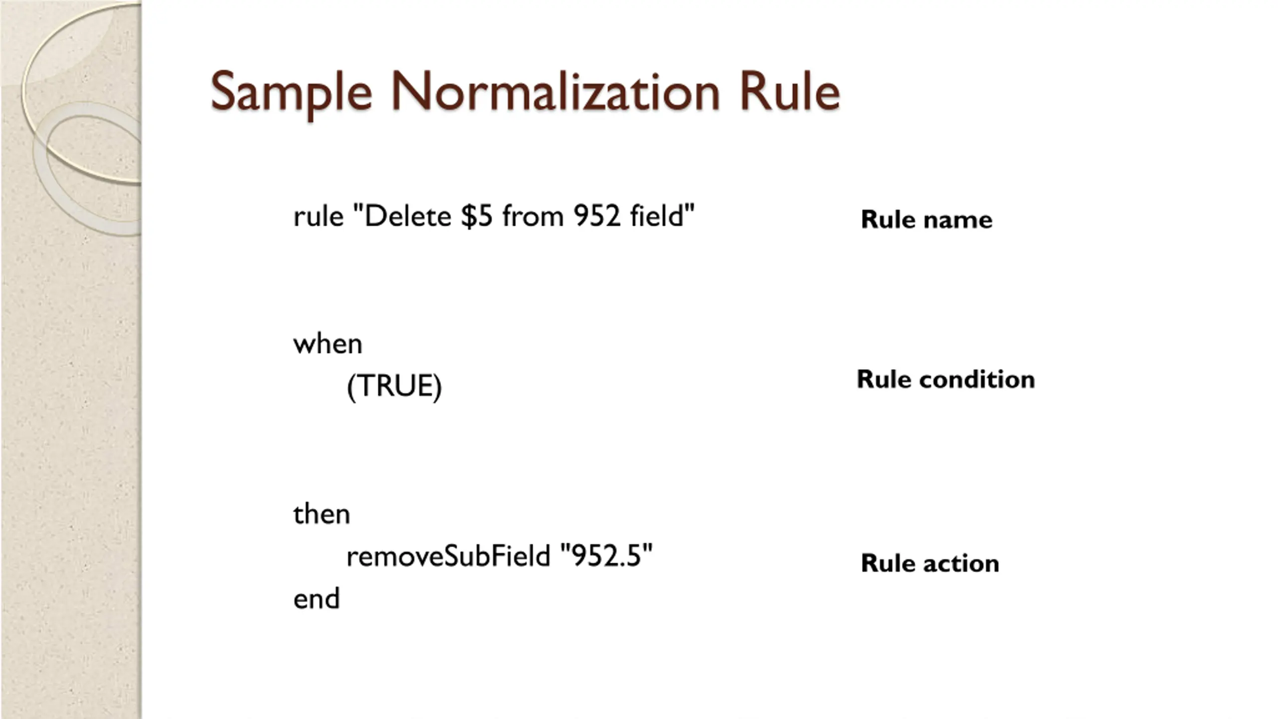 Sample Normalization Rule rule "Delete $5 from 952 field" Rule name when (TRUE) Rule condition then removeSubField "952.5" end Rule action