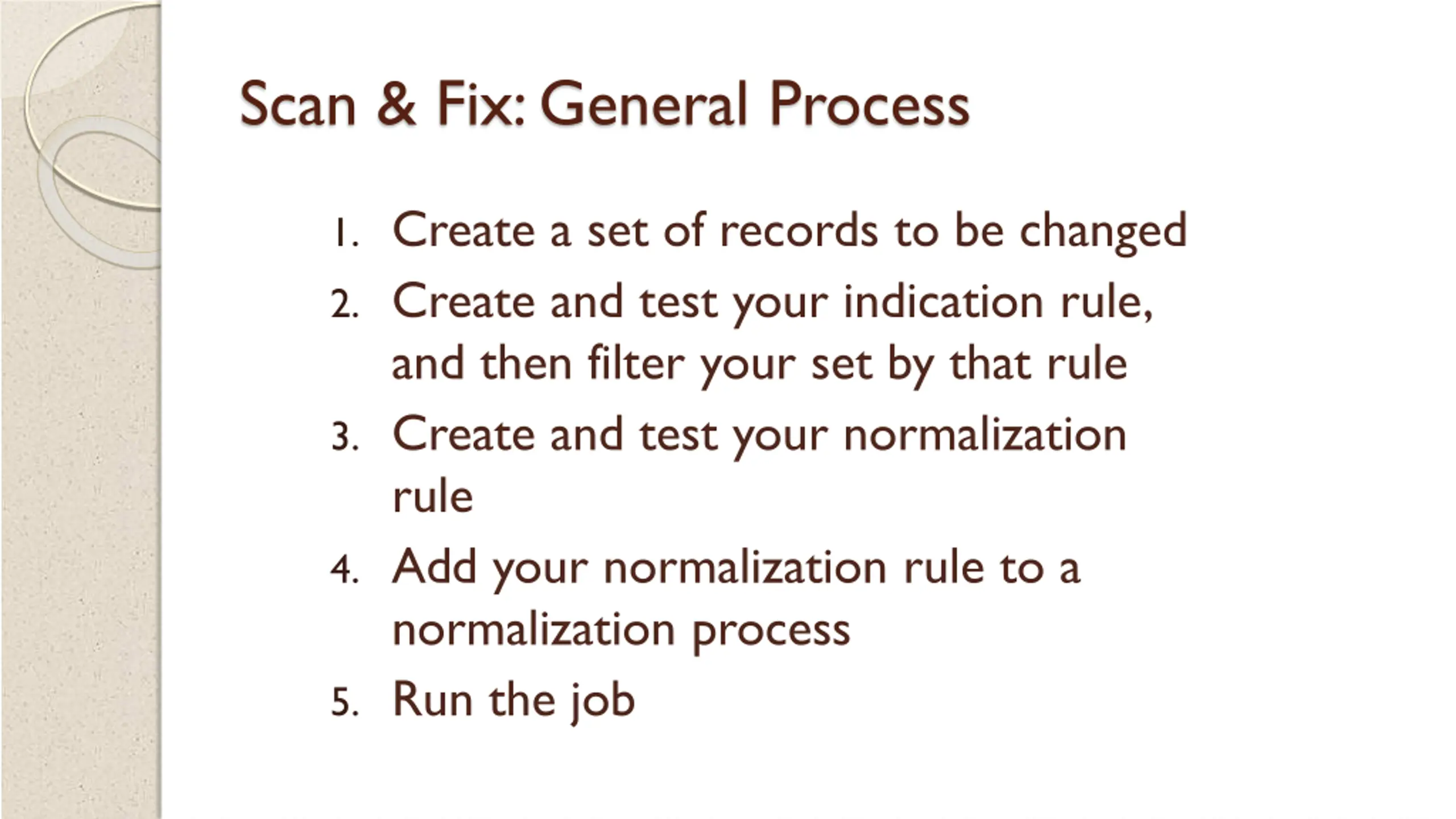 Scan & Fix: General Process 1. Create a set of records to be changed 2. Create and test your indication rule, and then filter your set by that rule 3. Create and test your normalization rule 4. Add your normalization rule to a normalization process 5. Run the job