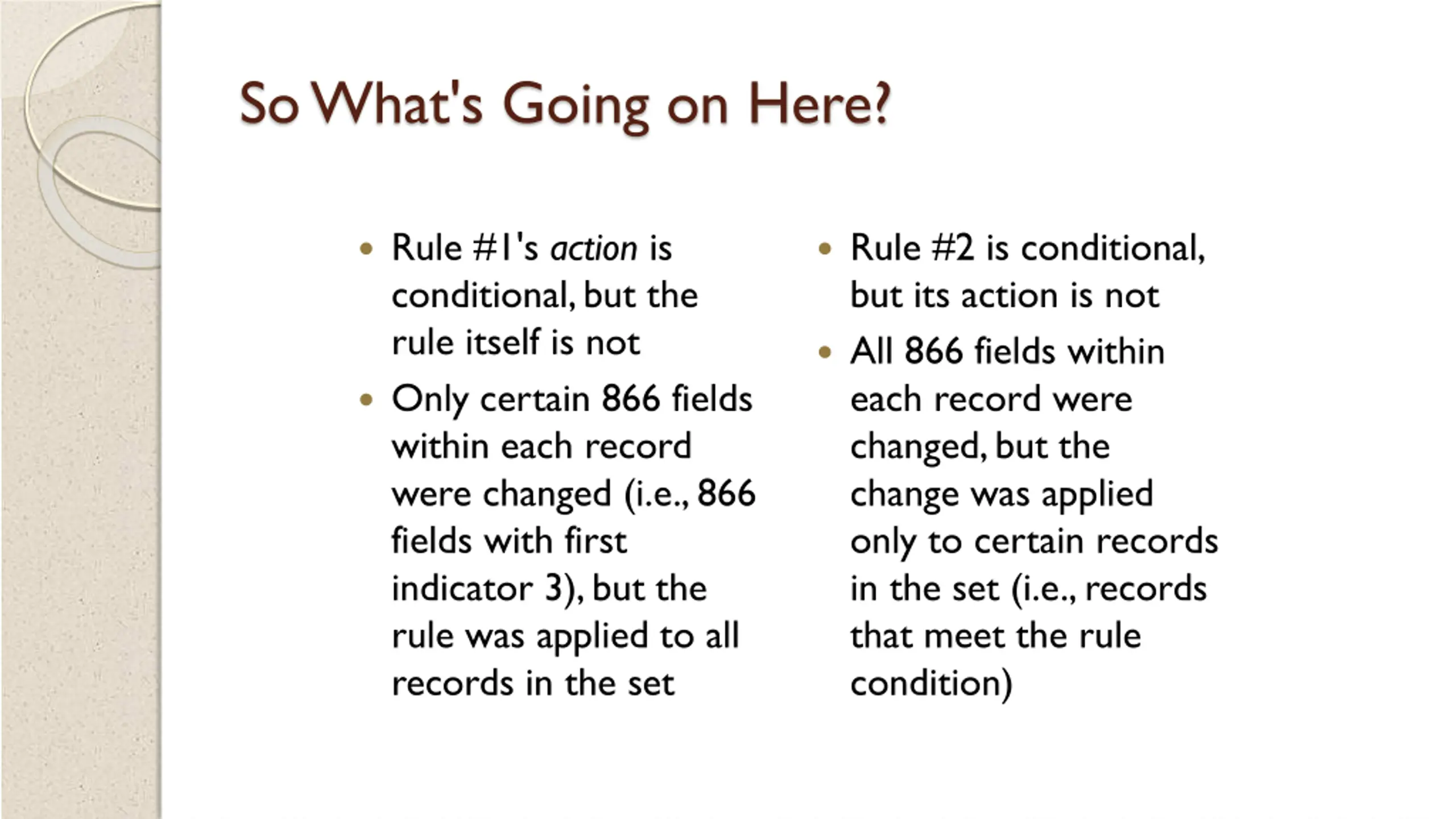 So What's Going on Here? Rule #1's action is conditional, but the rule itself is not Only certain 866 fields within each record were changed (i.e., 866 fields with first indicator 3), but the rule was applied to all records in the set Rule #2 is conditional, but its action is not All 866 fields within each record were changed, but the change was applied only to certain records in the set (i.e., records that meet the rule condition)