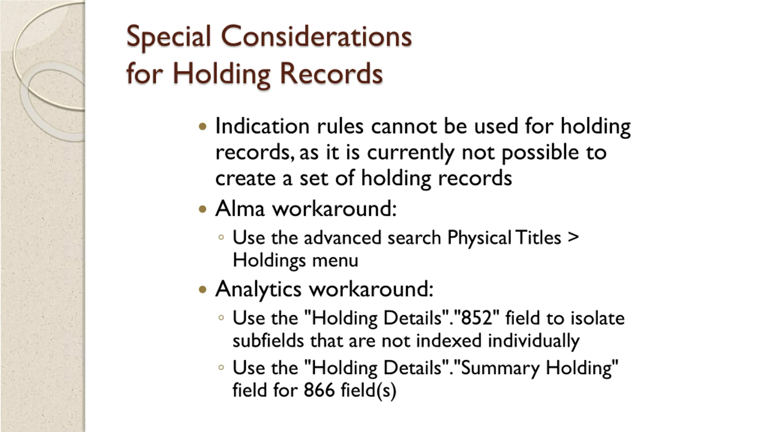Special Considerations for Holding Records Indication rules cannot be used for holding records, as it is currently not possible to create a set of holding records Alma workaround: Use the advanced search Physical Titles > Holdings menu Analytics workaround: Use the "Holding Details"."852" field to isolate subfields that are not indexed individually Use the "Holding Details"."Summary Holding" field for 866 field(s)