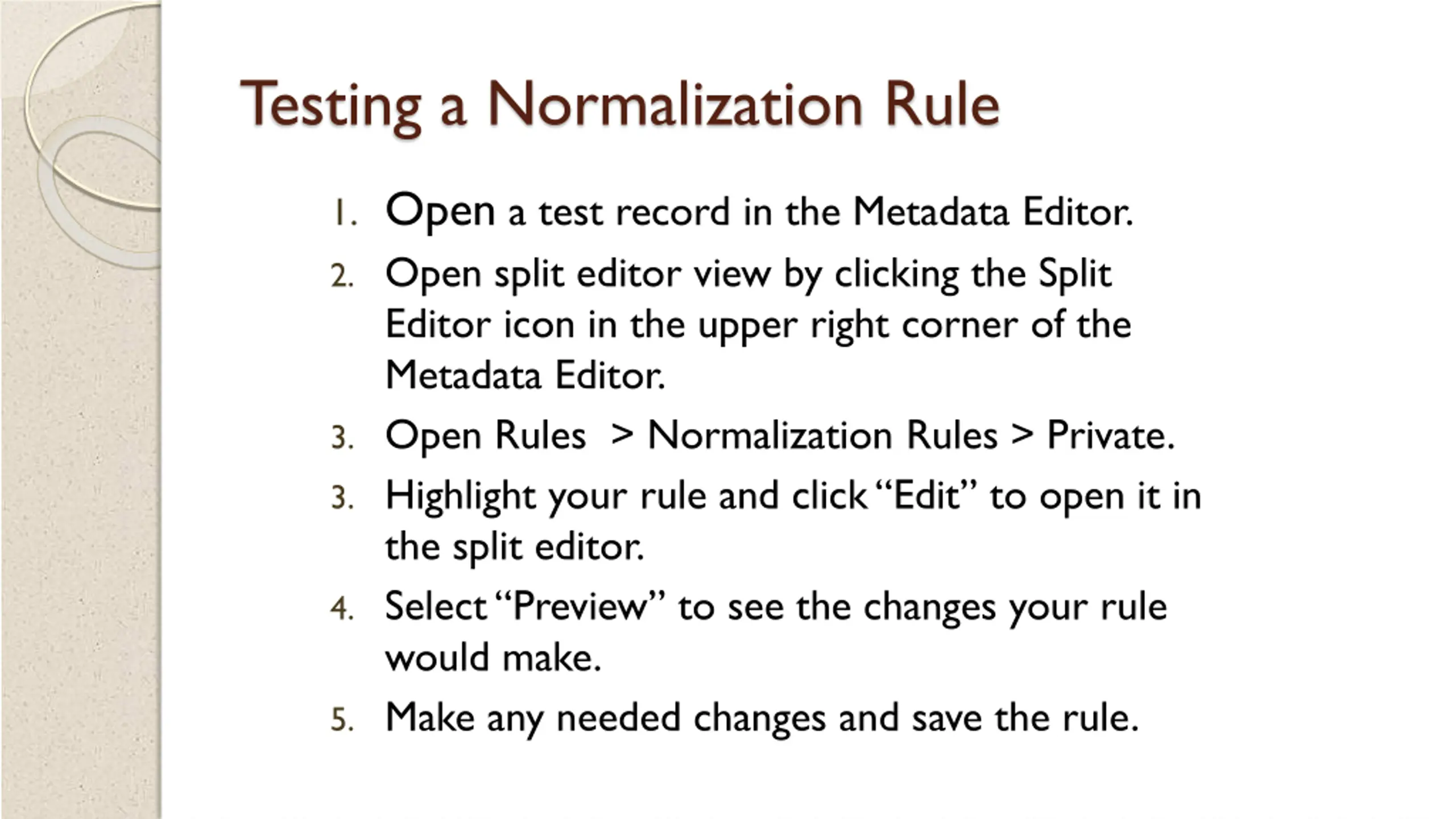 Testing a Normalization Rule 1. Open a test record in the Metadata Editor. 2. Open split editor view by clicking the Split Editor icon in the upper right corner of the Metadata Editor. 3. Open Rules > Normalization Rules > Private. 3. Highlight your rule and click Edit to open it in the split editor. 4. Select Preview to see the changes your rule would make. 5. Make any needed changes and save the rule.