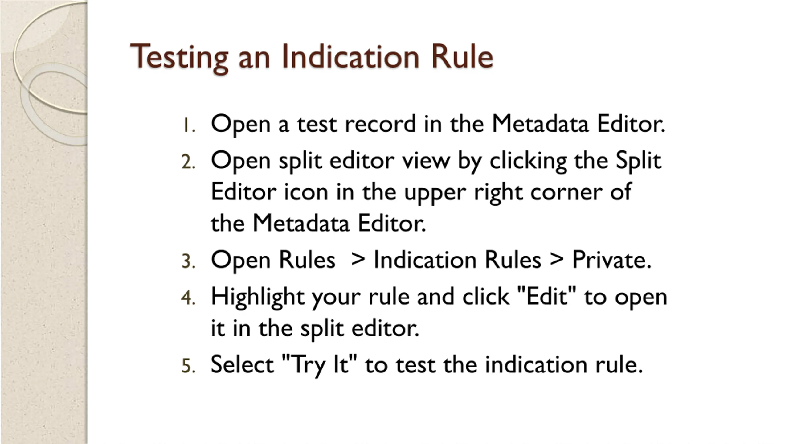 Testing an Indication Rule 1. Open a test record in the Metadata Editor. 2. Open split editor view by clicking the Split Editor icon in the upper right corner of the Metadata Editor. 3. Open Rules > Indication Rules > Private. 4. Highlight your rule and click "Edit" to open it in the split editor. 5. Select "Try It" to test the indication rule.