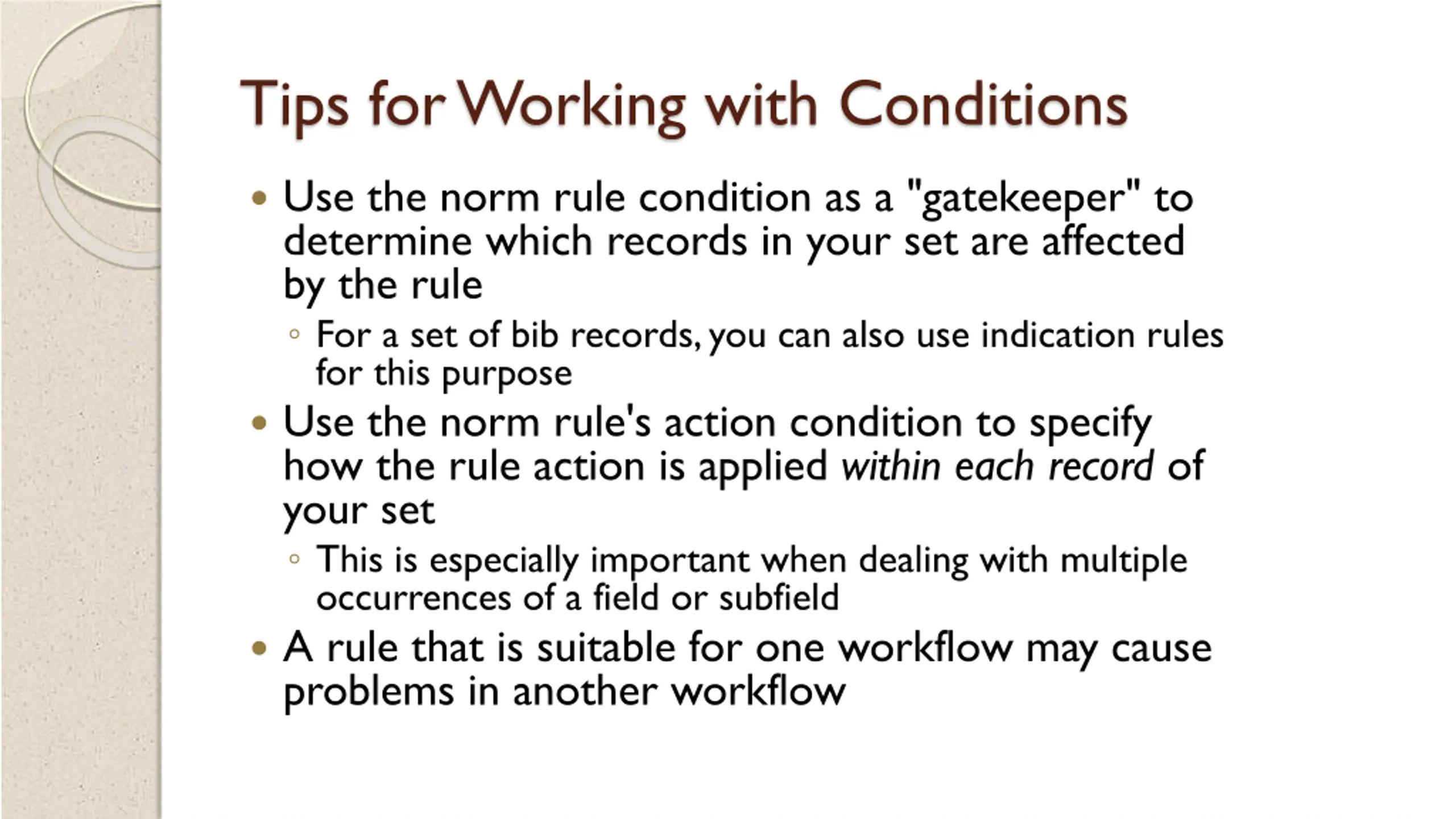 Tips for Working with Conditions Use the norm rule condition as a "gatekeeper" to determine which records in your set are affected by the rule For a set of bib records, you can also use indication rules for this purpose Use the norm rule's action condition to specify how the rule action is applied within each record of your set This is especially important when dealing with multiple occurrences of a field or subfield A rule that is suitable for one workflow may cause problems in another workflow