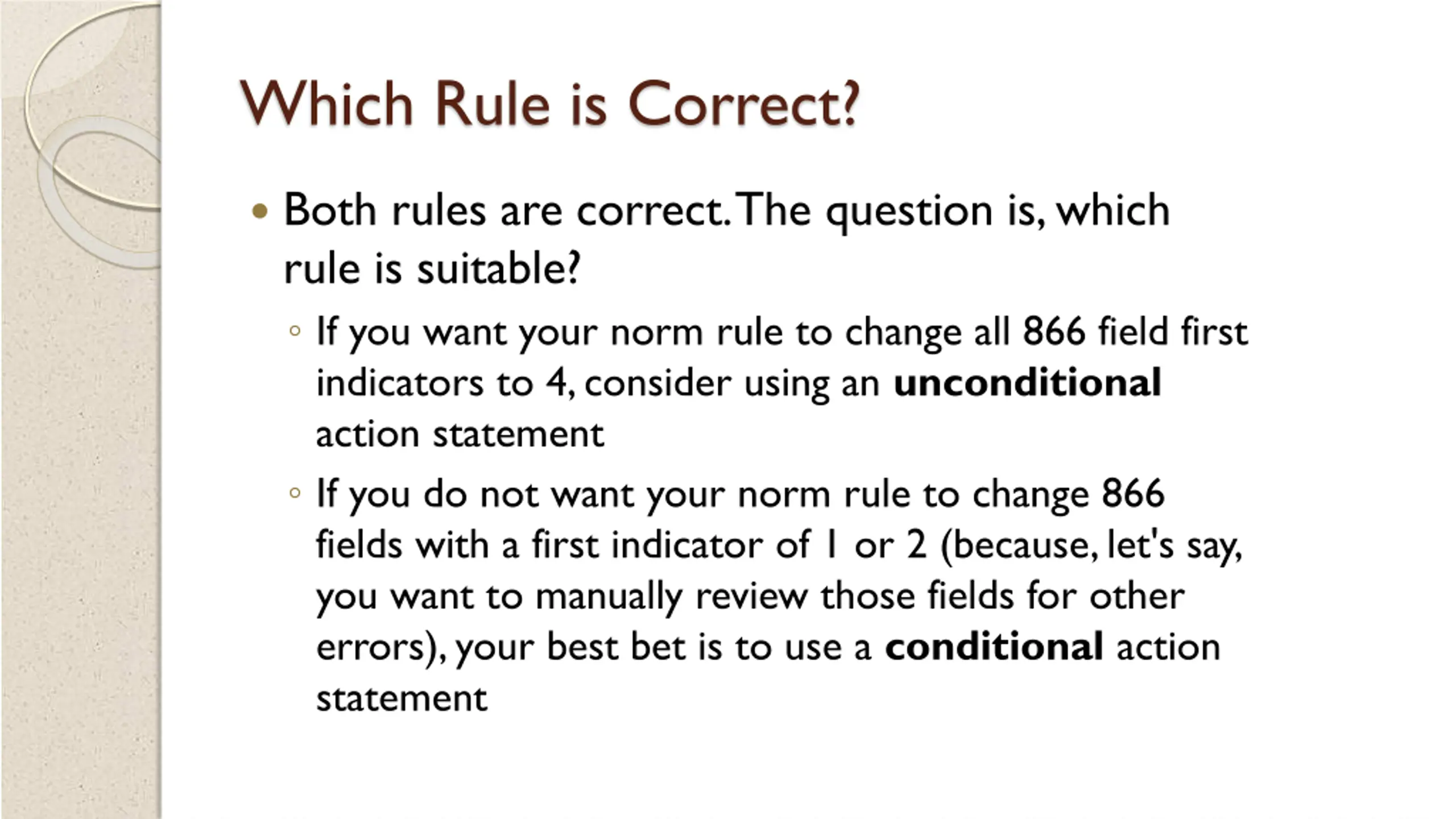 Which Rule is Correct? Both rules are correct. The question is, which rule is suitable? If you want your norm rule to change all 866 field first indicators to 4, consider using an unconditional action statement If you do not want your norm rule to change 866 fields with a first indicator of 1 or 2 (because, let's say, you want to manually review those fields for other errors), your best bet is to use a conditional action statement