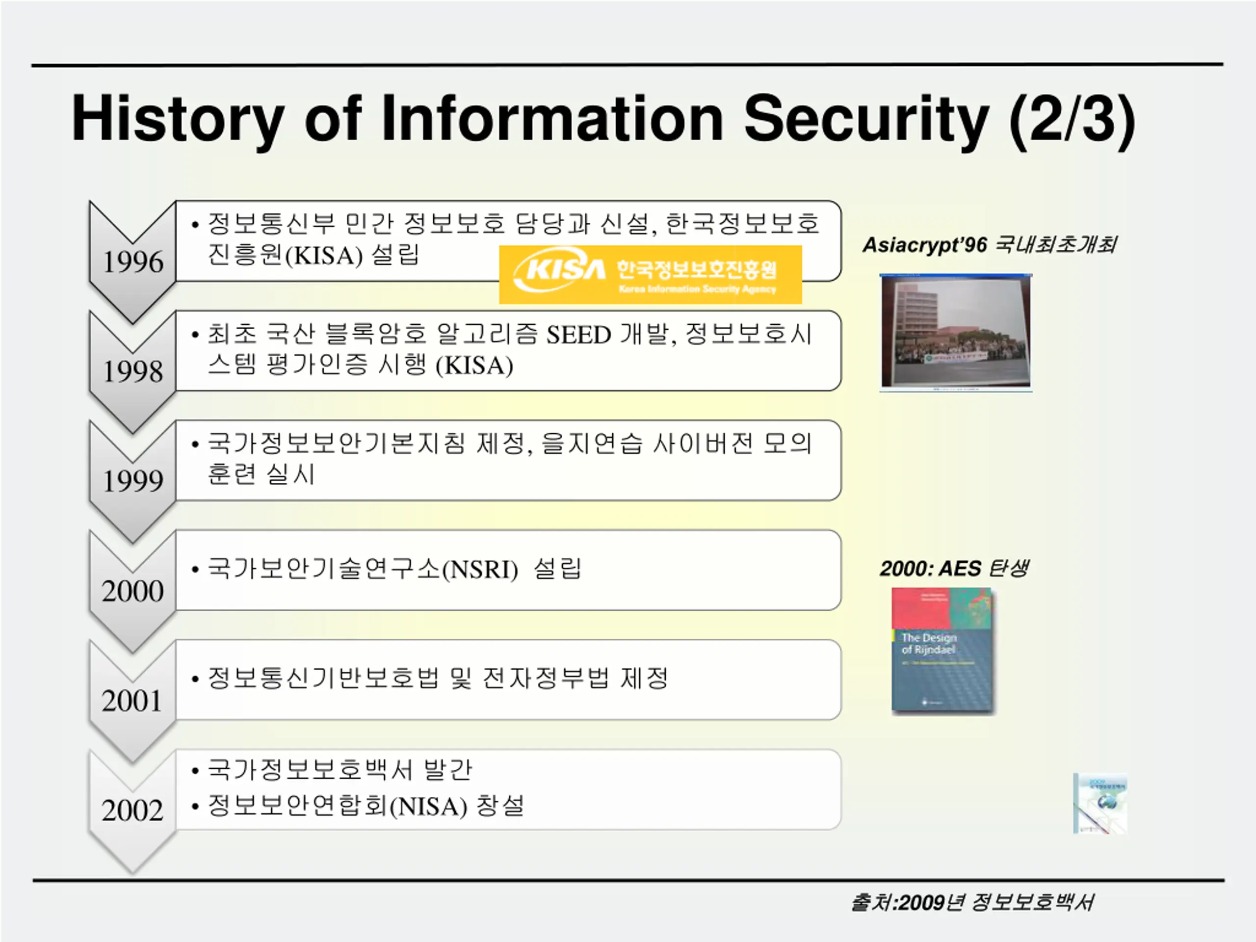 History of Information Security (2/3) , (KISA) Asiacrypt 96 1996 SEED , (KISA) 1998 , 1999 (NSRI) 2000: AES 2000 593963 2001 (NISA) 2002 :2009
