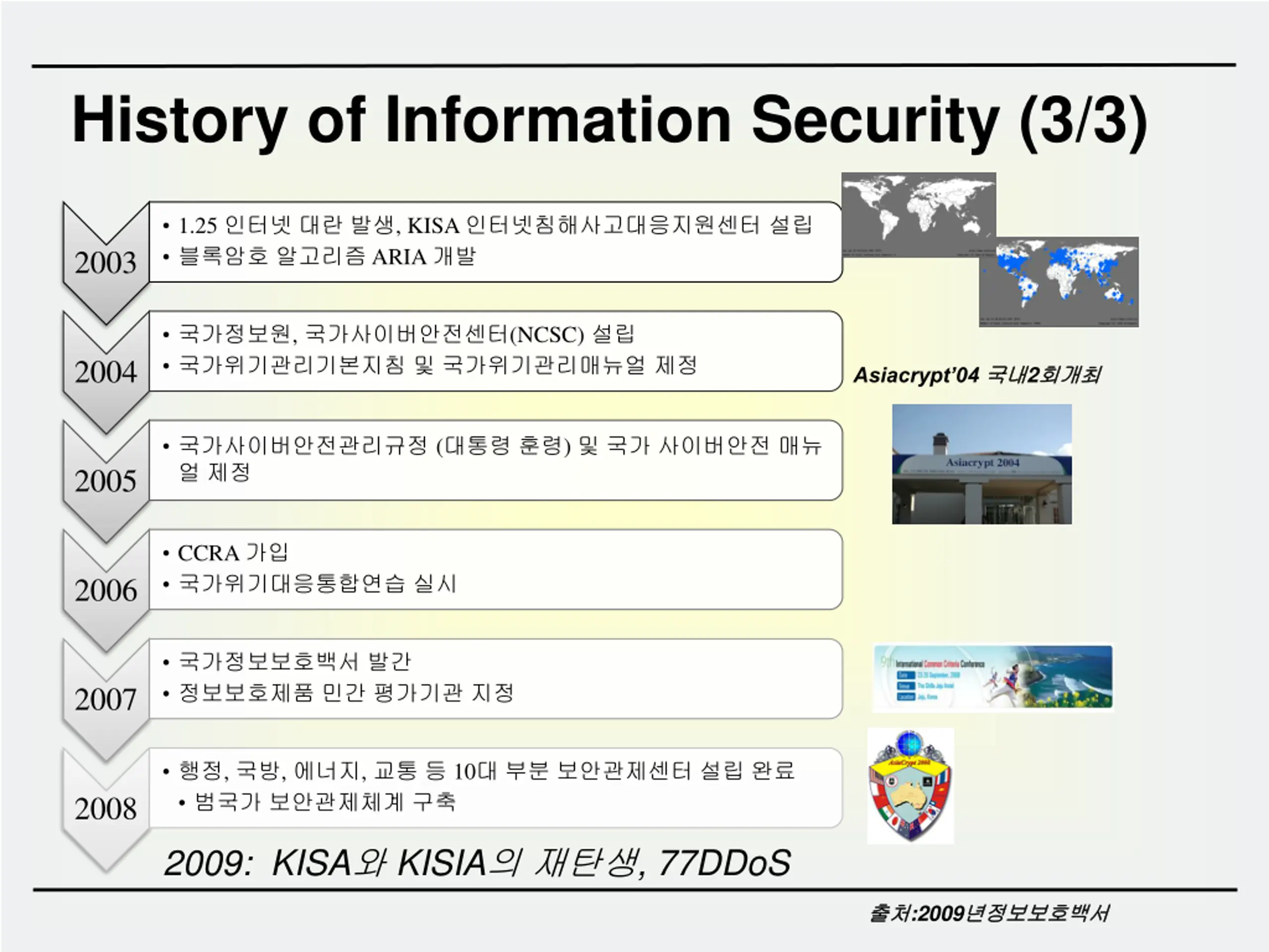 History of Information Security (3/3) 1.25 , KISA ARIA 2003 , (NCSC) 2004 2 Asiacrypt 04 ( ) 2005 CCRA 2006 2007 , , , 10 2008 2009: KISA KISIA , 77DDoS :2009