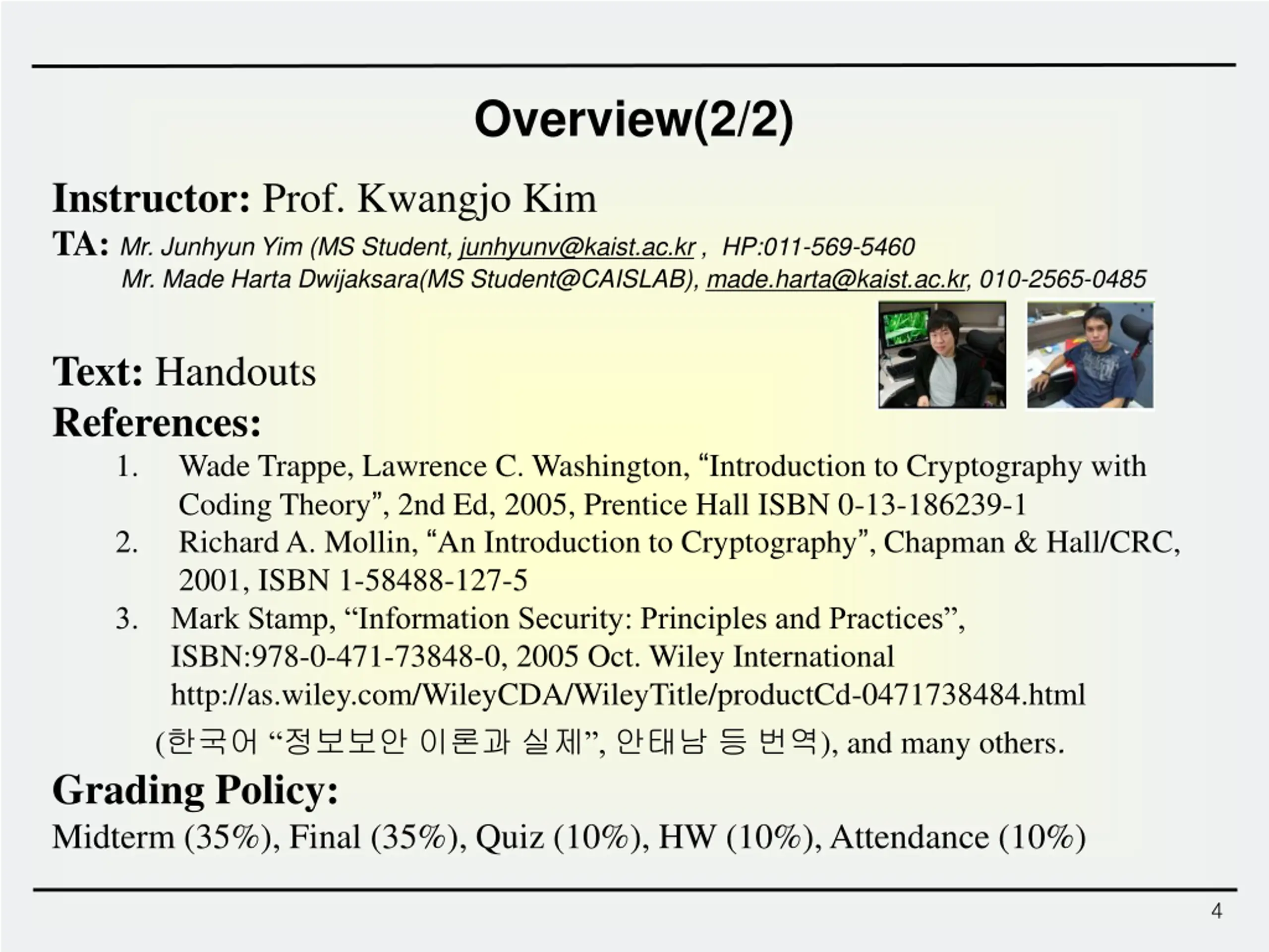 Overview(2/2) Instructor: Prof. Kwangjo Kim TA: Mr. Junhyun Yim (MS Student, junhyunv@kaist.ac.kr , HP:011-569-5460 Mr. Made Harta Dwijaksara(MS Student@CAISLAB), made.harta@kaist.ac.kr, 010-2565-0485 Text: Handouts References: 1. Wade Trappe, Lawrence C. Washington, Introduction to Cryptography with Coding Theory , 2nd Ed, 2005, Prentice Hall ISBN 0-13-186239-1 2. Richard A. Mollin, An Introduction to Cryptography , Chapman & Hall/CRC, 2001, ISBN 1-58488-127-5 3. Mark Stamp, Information Security: Principles and Practices , ISBN:978-0-471-73848-0, 2005 Oct. Wiley International http://as.wiley.com/WileyCDA/WileyTitle/productCd-0471738484.html ( , ), and many others. Grading Policy: Midterm (35%), Final (35%), Quiz (10%), HW (10%), Attendance (10%) 4
