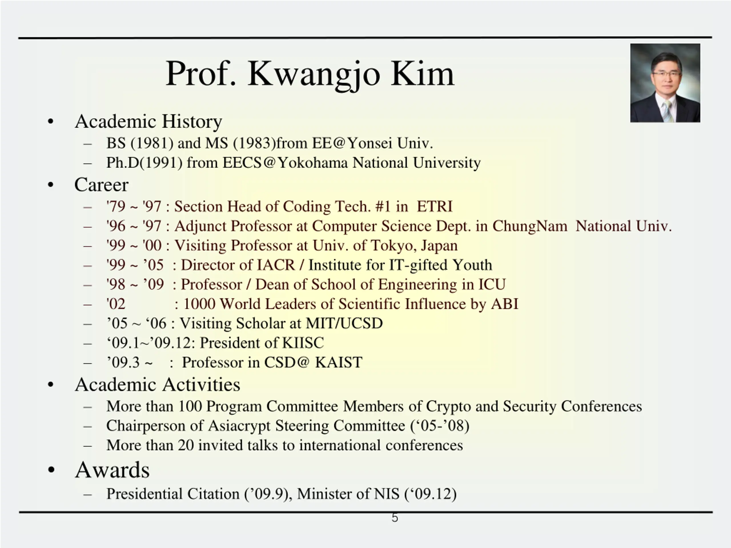 Prof. Kwangjo Kim Academic History BS (1981) and MS (1983)from EE@Yonsei Univ. Ph.D(1991) from EECS@Yokohama National University Career '79 ~ '97 : Section Head of Coding Tech. #1 in ETRI '96 ~ '97 : Adjunct Professor at Computer Science Dept. in ChungNam National Univ. '99 ~ '00 : Visiting Professor at Univ. of Tokyo, Japan '99 ~ 05 : Director of IACR / Institute for IT-gifted Youth '98 ~ 09 : Professor / Dean of School of Engineering in ICU '02 : 1000 World Leaders of Scientific Influence by ABI 05 ~ 06 : Visiting Scholar at MIT/UCSD 09.1~ 09.12: President of KIISC 09.3 ~ : Professor in CSD@ KAIST Academic Activities More than 100 Program Committee Members of Crypto and Security Conferences Chairperson of Asiacrypt Steering Committee ( 05- 08) More than 20 invited talks to international conferences Awards Presidential Citation ( 09.9), Minister of NIS ( 09.12) 5